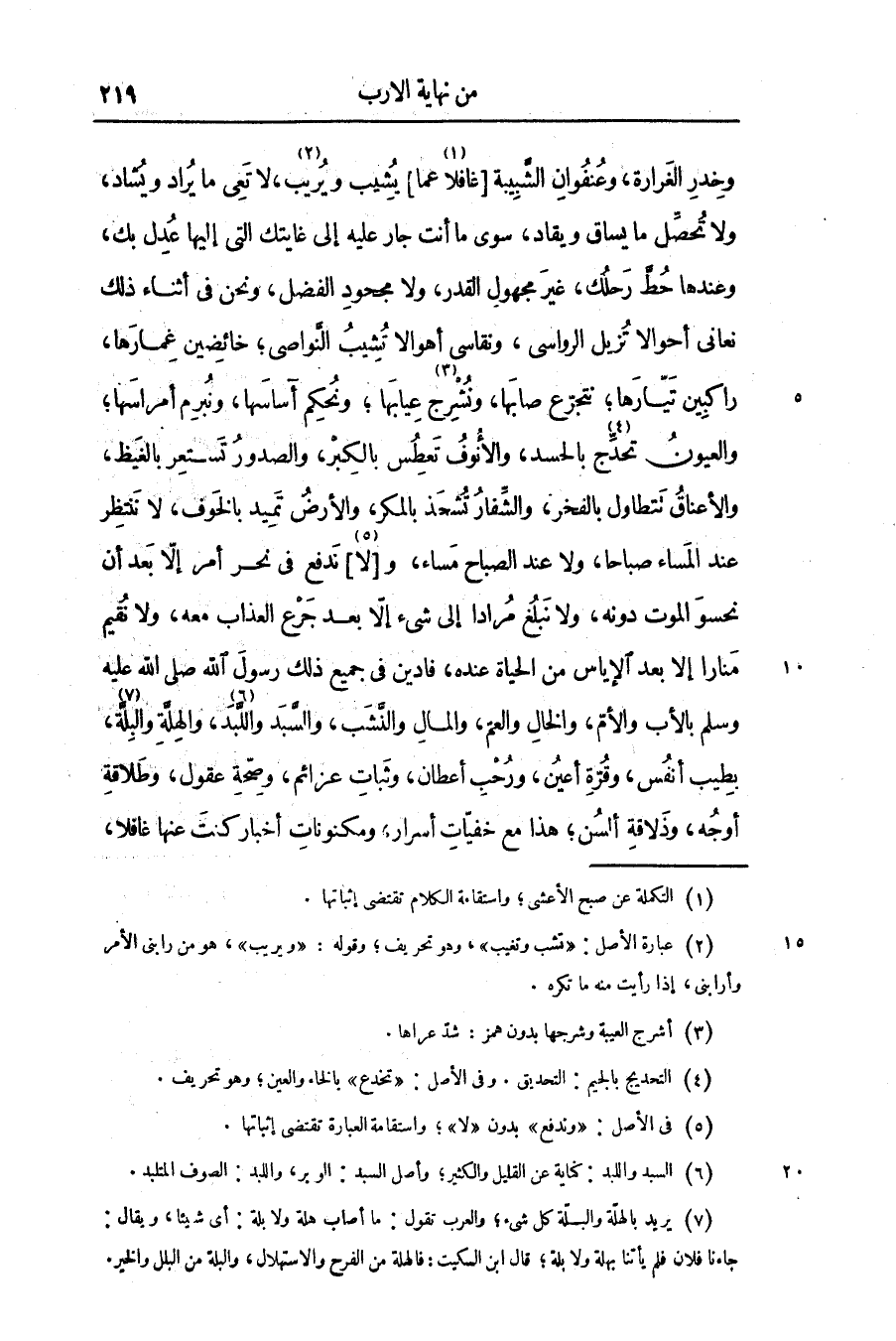 وخدر الغرارة، وعنفوان الشّبيبة [غافلا «1» عما] يشيب ويريب «2» ، لا تعى ما يراد ويشاد، ولا تحصّل ما يساق ويقاد، سوى ما أنت جار عليه إلى غايتك التى إليها عدل بك، وعندها حطّ رحلك، غير مجهول القدر، ولا مجحود الفضل، ونحن فى أثناء ذلك نعانى أحوالا تزيل الرواسى، ونقاسى أهوالا تشيب النّواصى؛ خائضين غمارها، راكبين تيّارها؛ نتجرّع صابها، ونشرج «3» عيابها؛ ونحكم أساسها، ونبرم أمراسها؛ والعيون تحدّج «4» بالحسد، والأنوف تعطس بالكبر، والصدور تستعر بالغيظ، والأعناق تتطاول بالفخر، والشّفار تشحذ بالمكر، والأرض تميد بالخوف، لا تنتظر عند المساء صباحا، ولا عند الصباح مساء، و [لا «5» ] ندفع فى نحر أمر إلّا بعد أن نحسو الموت دونه، ولا نبلغ مرادا إلى شىء إلّا بعد جرع العذاب معه، ولا نقيم منارا إلا بعد الإياس من الحياة عنده، فادين فى جميع ذلك رسول الله صلّى الله عليه وسلّم بالأب والأمّ، والخال والعمّ، والمال والنّشب، والسّبد واللّبد «6» ، والهلّة والبلّة «7» ، بطيب أنفس، وقرّة أعين، ورحب أعطان، وثبات عزائم، وصحّة عقول، وطلاقه أوجه، وذلاقة ألسن؛ هذا مع خفيّات أسرار، ومكنونات أخبار كنت عنها غافلا،
