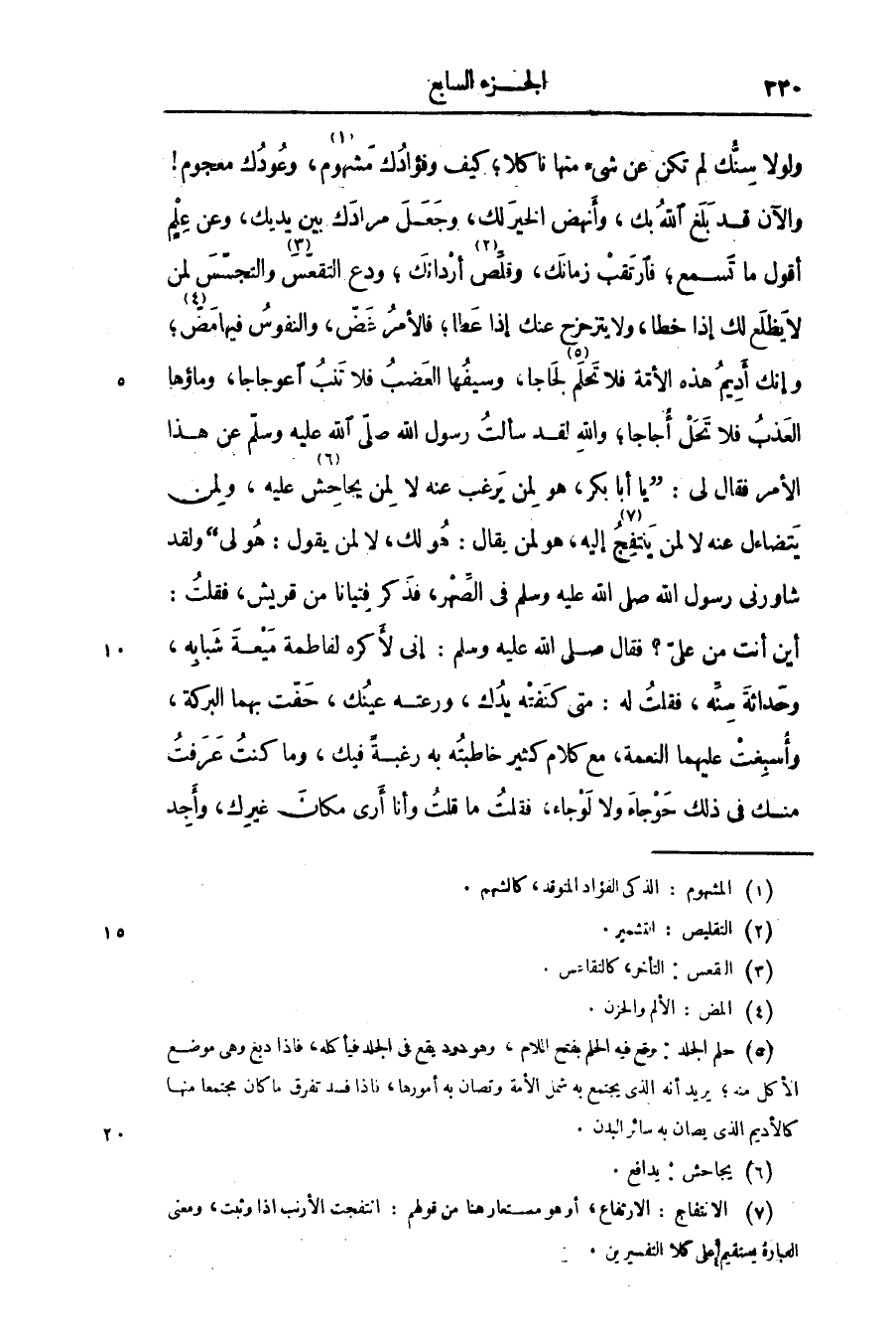 أين أنت من علىّ؟ فقال صلّى الله عليه وسلّم: إنى لأكره لفاطمة ميعة شبابه، وحداثة سنّه، فقلت له: متى كنفته يدك، ورعته عينك، حفّت بهما البركة، وأسبغت عليهما النعمة، مع كلام كثير خاطبته به رغبة فيك، وما كنت عرفت منك فى ذلك حوجاء ولا للوجاء، فقلت ما قلت وأنا أرى مكان غيرك، وأجد