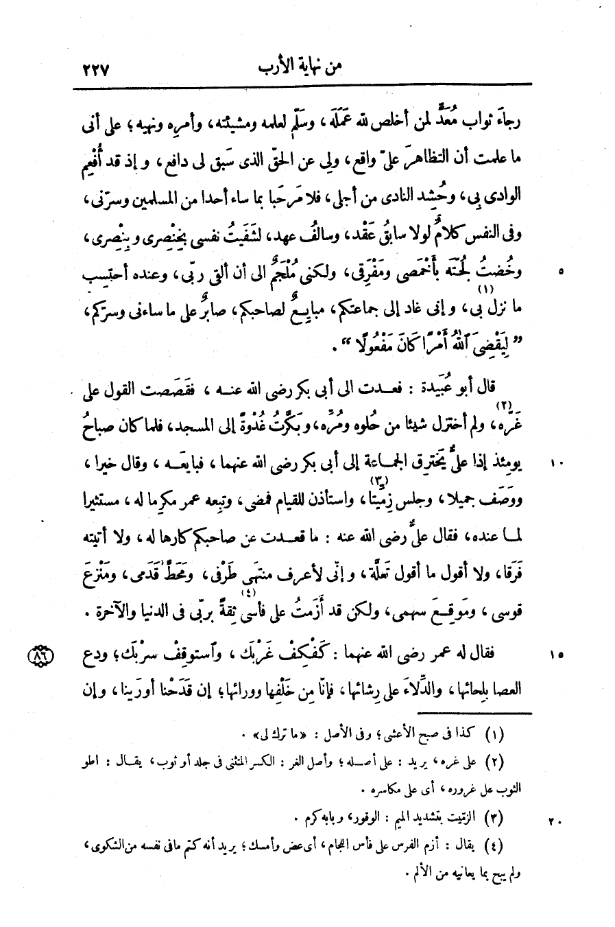 رجاء ثواب معدّ لمن أخلص لله عمله، وسلّم لعلمه ومشيئته، وأمره ونهيه؛ على أنى ما علمت أن التظاهر علىّ واقع، ولى عن الحقّ الذى سبق لى دافع، وإذ قد أفعم الوادى بى، وحشد النادى من أجلى، فلا مرحبا بما ساء أحدا من المسلمين وسرّنى، وفى النفس كلام لولا سابق عقد، وسالف عهد، لشفيت نفسى بخنصرى وبنصرى، وخضت لجته بأخمصى ومفرقى، ولكنى ملجم الى أن ألقى ربّى، وعنده أحتسب ما نزل «1» بى، وإنى غاد إلى جماعتكم، مبايع لصاحبكم، صابر على ما ساءنى وسرّكم، «ليقضى الله أمرا كان مفعولا» .