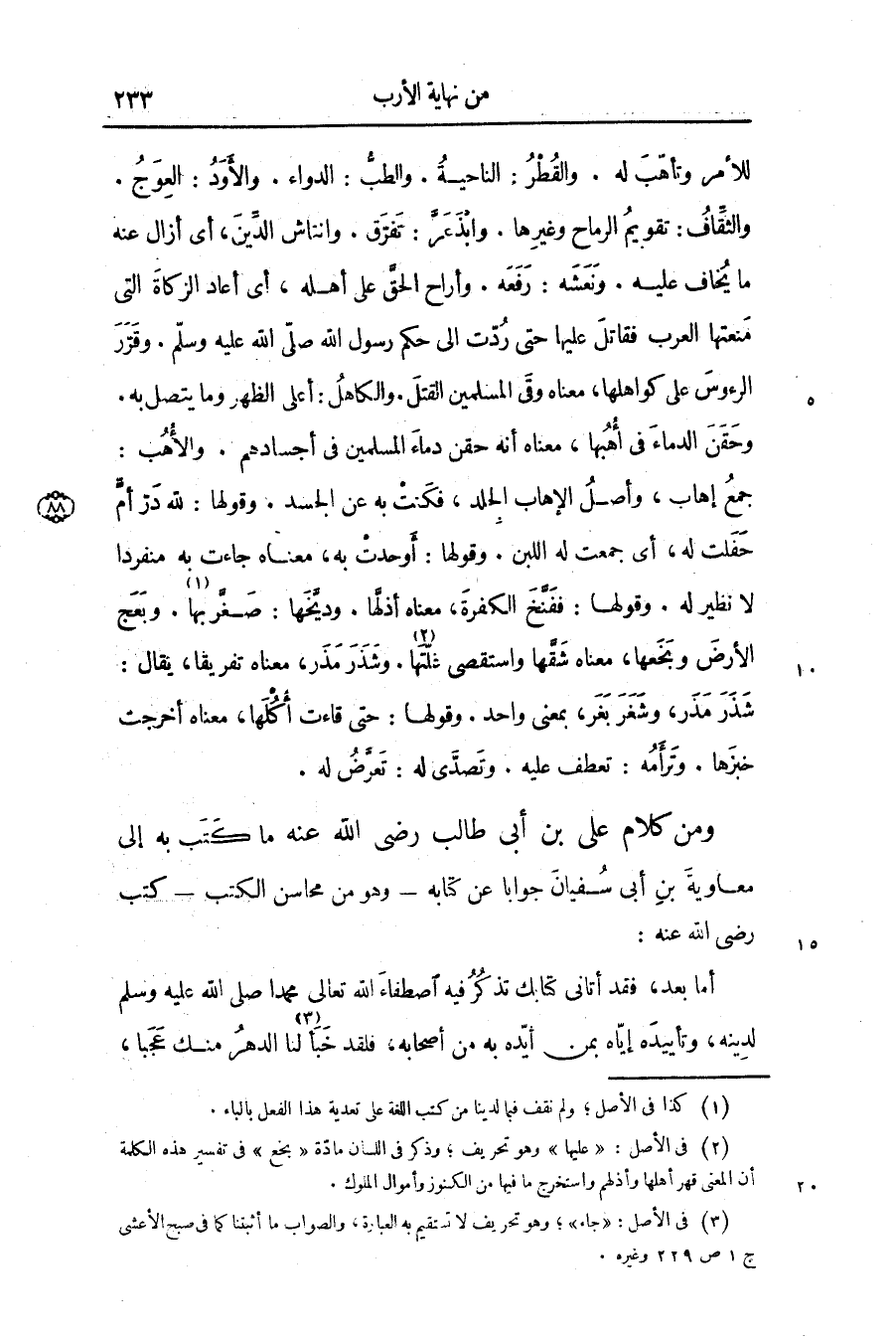 والثّقاف: تقويم الرماح وغيرها. وابذعرّ: تفرّق. وانتاش الدّين، أى أزال عنه ما يخاف عليه. ونعشه: رفعه. وأراح الحقّ على أهله، أى أعاد الزكاة التى منعتها العرب فقاتل عليها حتى ردّت الى حكم رسول الله صلّى الله عليه وسلّم. وقرّر الرءوس على كواهلها، معناه وقى المسلمين القتل. والكاهل: أعلى الظهر وما يتصل به.
