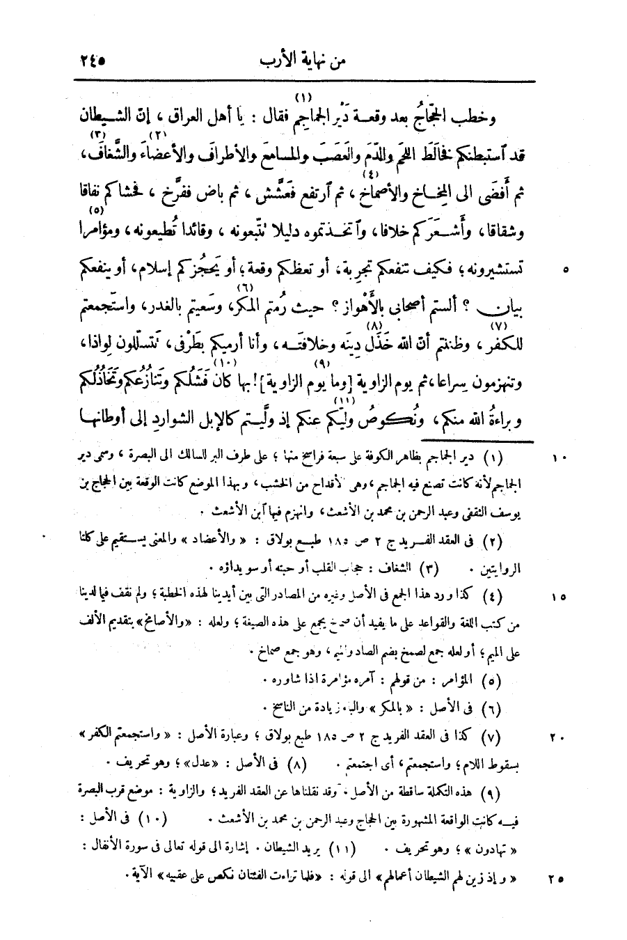 وخطب الحجّاج بعد وقعة دير الجماجم «1» فقال: يا أهل العراق، إنّ الشيطان قد استبطنكم فخالط اللحم والدّم والعصب والمسامع والأطراف والأعضاء «2» والشّغاف «3» ، ثم أفضى الى المخاخ والأصماخ «4» ، ثم ارتفع فعشّش، ثم باض ففرّخ، فحشاكم نفاقا وشقاقا، وأشعركم خلافا، واتخذتموه دليلا تتّبعونه، وقائدا تطيعونه، ومؤامرا «5» تستشيرونه؛ فكيف تنفعكم تجربة، أو تعظكم وقعة؛ أو يحجزكم إسلام، أو ينفعكم بيان؟ ألستم أصحابى بالأهواز؟ حيث رمتم المكر «6» ، وسعيتم بالغدر، واستجمعتم للكفر «7» ، وظننتم أنّ الله خذل «8» دينه وخلافته، وأنا أرميكم بطرفى، تتسلّلون لو اذا، وتنهزمون سراعا، ثم يوم الزاوية [وما يوم «9» الزاوية] ! بها كان «10» فشلكم وتنازعكم وتخاذلكم وبراءة الله منكم، ونكوص وليّكم «11» عنكم إذ ولّيتم كالإبل الشوارد إلى أوطانها