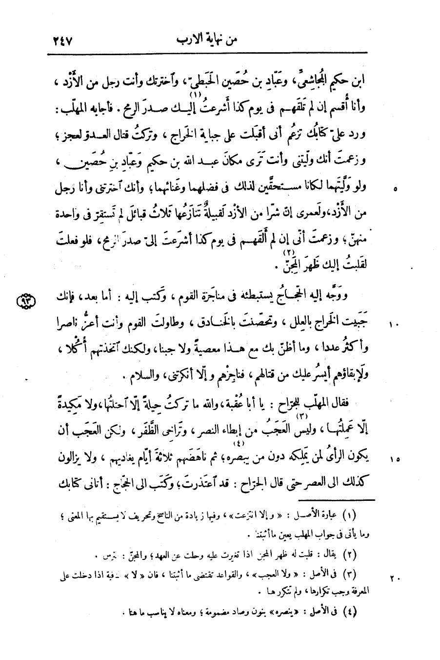 فقال المهلّب للجرّاح: يا أبا عقبة، والله ما تركت حيلة إلّا احتلتها، ولا مكيدة إلّا عملتها، وليس «3» العجب من إبطاء النصر، وتراخى الظّفر، ولكن العجب أن يكون الرأى لمن يملكه دون من يبصره «4» ؛ ثم ناهضهم ثلاثة أيّام يغاديهم، ولا يزالون كذلك الى العصر حتى قال الجرّاح: قد اعتذرت؛ وكتب الى الحجّاج: أتانى كتابك