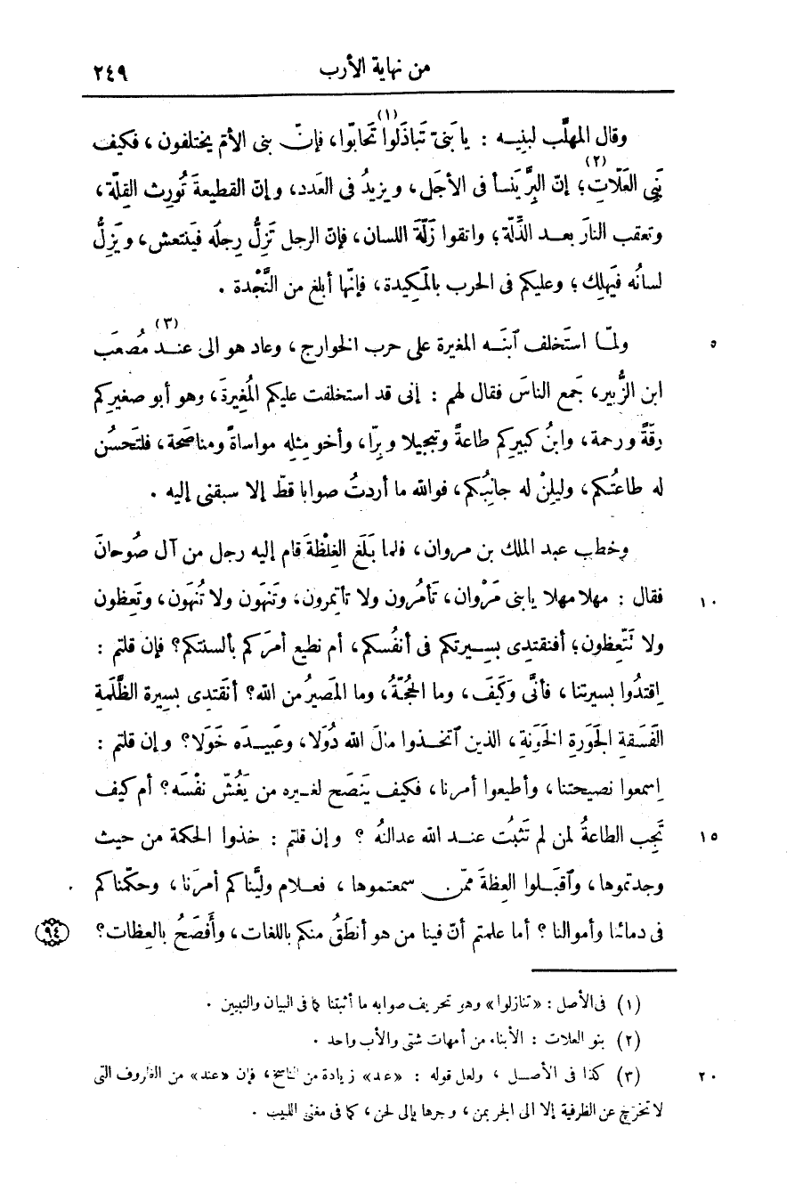 وقال المهلّب لبنيه: يا بنىّ تباذلوا «1» تحابّوا، فإن بنى الأمّ يختلفون، فكيف بنى العلّات «2» ؛ إنّ البرّ ينسأ فى الأجل، ويزيد فى العدد، وإنّ القطيعة تورث القلّة، وتعقب النار بعد الذّلّة؛ واتقوا زلّة اللسان، فإنّ الرجل تزلّ رجله فينتعش، ويزلّ لسانه فيهلك؛ وعليكم فى الحرب بالمكيدة، فإنّها أبلغ من النّجدة.