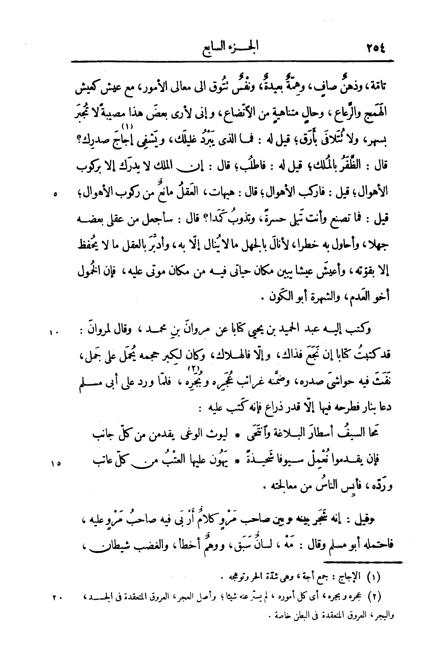 تامّة، وذهن صاف، وهمّة بعيدة، ونفس تتوق الى معالى الأمور، مع عيش كعيش الهمج والرّعاع، وحال متناهية من الاتّضاع، وإنى لأرى بعض هذا مصيبة لا تجبر بسهر، ولا تتلافى بأرق؛ قيل له: فما الذى يبرد غليلك، ويشفى إجاج «1» صدرك؟