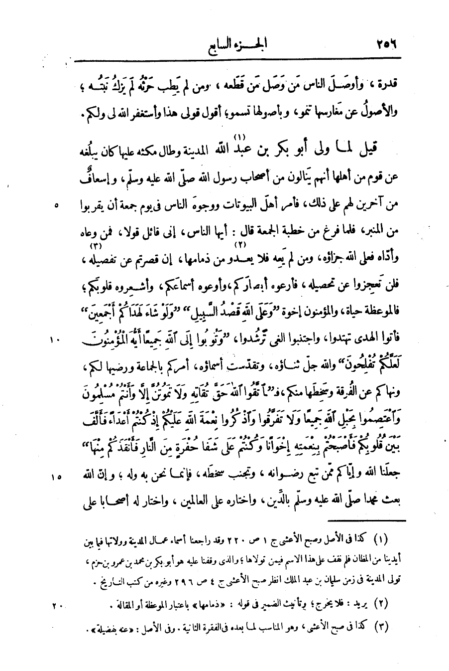 كان يبلغه عن قوم من أهلها أنهم ينالون من أصحاب رسول الله صلّى الله عليه وسلّم، وإسعاف من آخرين لهم على ذلك، فأمر أهل البيوتات ووجوه الناس فى يوم جمعة أن يقربوا من المنبر، فلما فرغ من خطبة الجمعة قال: أيها الناس، إنى قائل قولا، فمن وعاه وأدّاه فعلى الله جزاؤه، ومن لم يعه فلا يعدو «2» من ذمامها، إن قصرتم عن تفصيله «3» ، فلن تعجزوا عن تحصيله، فأرعوه أبصاركم، وأوعوه أسماعكم، وأشعروه قلوبكم؛ فالموعظة حياة، والمؤمنون إخوة «وعلى الله قصد السّبيل» «ولو شاء لهداكم أجمعين» فأتوا الهدى تهتدوا، واجتنبوا الغى ترشدوا، «وتوبوا إلى الله جميعا أيّه المؤمنون لعلّكم تفلحون» والله جلّ ثناؤه، وتقدّست أسماؤه، أمركم بالجماعة ورضيها لكم، ونهاكم عن الفرقة وسخطها منكم، ف «اتّقوا الله حقّ تقاته ولا تموتنّ إلّا وأنتم مسلمون واعتصموا بحبل الله جميعا ولا تفرّقوا واذكروا نعمة الله عليكم إذ كنتم أعداء فألّف بين قلوبكم فأصبحتم بنعمته إخوانا وكنتم على شفا حفرة من النّار فأنقذكم منها» جعلنا الله وإيّاكم ممّن تبع رضوانه، وتجنب سخطه، فإنما نحن به وله؛ وإنّ الله بعث محمدا صلّى الله عليه وسلّم بالدّين، واختاره على العالمين، واختار له أصحابا على