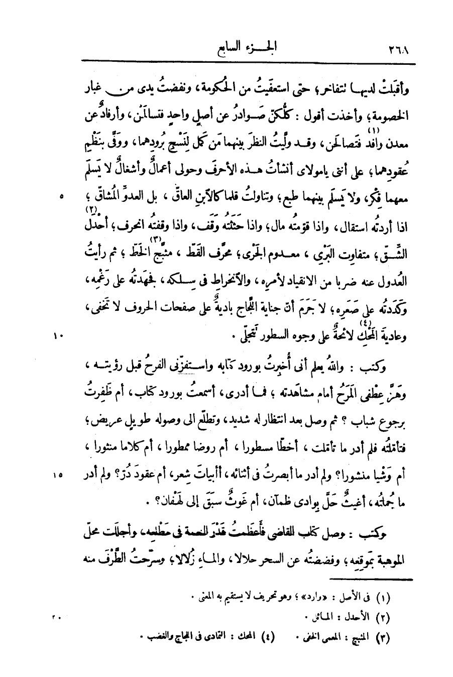 واقبلت لديها تتفاخر؛ حتى استعفيت من الحكومة، ونفضت يدى من غبار الخصومة؛ وأخذت أقول: كلّكنّ صوادر عن أصل واحد فتسالمن، وأرفاد عن معدن رافد «1» فتصالحن، وقد ولّيت النظر بينهما من كمل لنسج برودهما، ووفّى بنظم عقودهما؛ على أننى يا مولاى أنشأت هذه الأحرف وحولى أعمال وأشغال لا يسلم معهما فكر، ولا يسلم بينهما طبع؛ وتناولت قلما كالابن العاقّ، بل العدوّ المشاقّ؛ اذا أردته استقال، واذا قوّمته مال؛ واذا حثثته وقف، واذا وقفته انحرف؛ أحدل «2» الشّقّ؛ متفاوت البرى، معدوم الجرى؛ محرّف القطّ، مثبّج «3» الخطّ؛ ثم رأيت العدول عنه ضربا من الانقياد لأمره، والانخراط فى سلكه، فجهدته على رغمه، وكددته على صعره؛ لا جرم أنّ جناية اللّجاج بادية على صفحات الحروف لا تخفى، وعادية المحك «4» لائحة على وجوه السطور تتجلّى.