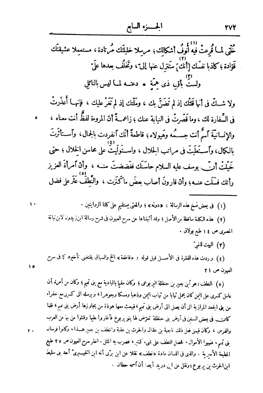 ولا شكّ فى أنها قلتك إذ لم تضنّ بك، وملّتك إذ لم تغر عليك، فإنها أعذرت فى السّفارة لك، وما قصرت فى النيابة عنك؛ زاعمة أنّ المروءة لفظ أنت معناه، والإنسانيّة اسم أنت جسمه وهيولاه؛ قاطعة أنّك انفردت بالجمال، واستأثرت بالكمال، واستعليت فى مراتب الجلال، واستوليت «4» على محاسن الخلال؛ حتى خيّلت أنّ يوسف عليه السلام حاسنك فغضضت منه، وأنّ امرأة العزيز رأتك فسلت عنه؛ وأنّ قارون أصاب بعض ما كنزت، والنّطف «5» عثر على فضل