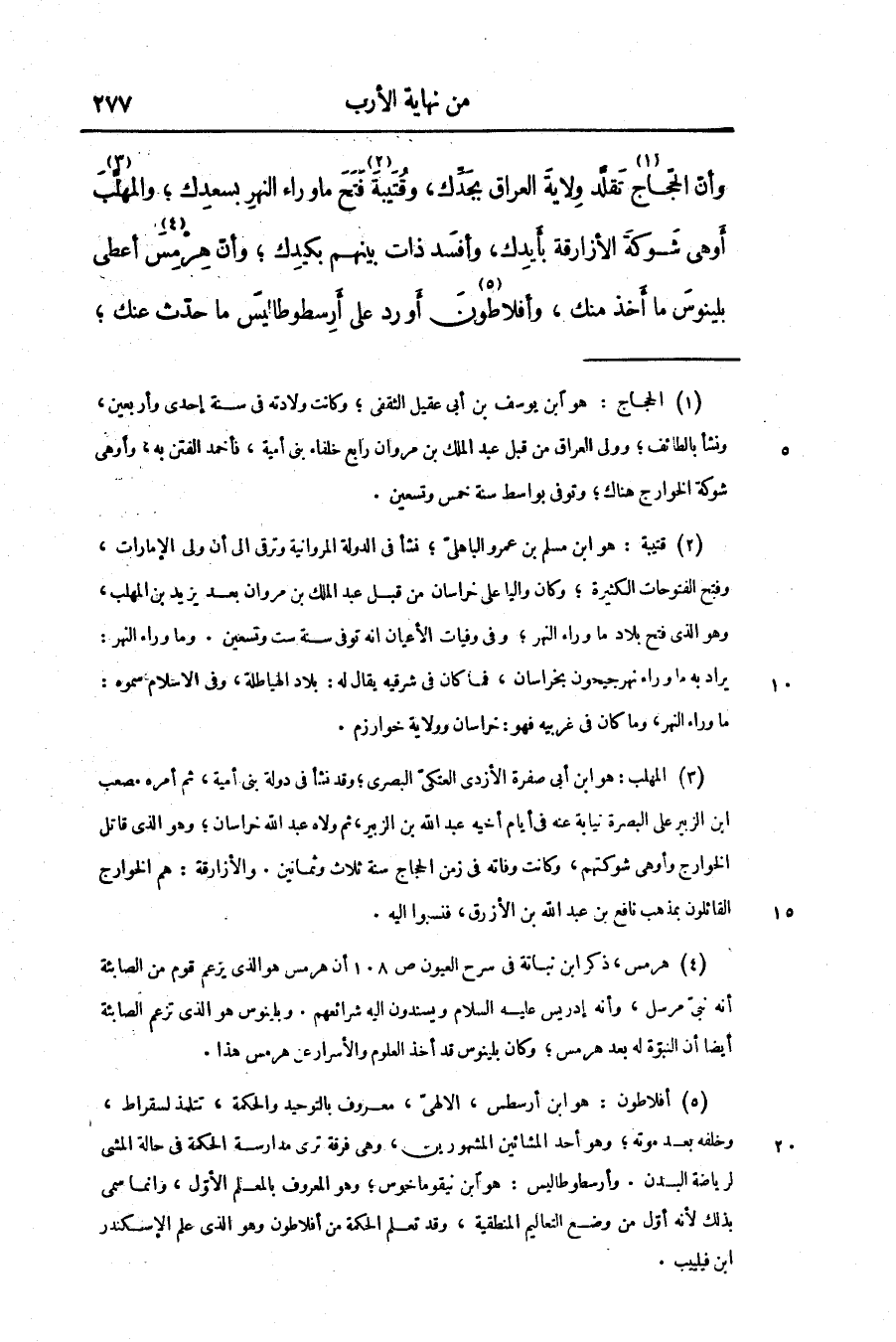 وأنّ الحجّاج «1» تقلّد ولاية العراق بجدّك، وقتيبة «2» فتح ماوراء النهر بسعدك؛ والمهلّب «3» أو هى شوكة الأزارقة بأيدك، وأفسد ذات بينهم بكيدك؛ وأنّ هرمس «4» أعطى بلينوس ما أخذ منك، وأفلاطون «5» أورد على أرسطوطاليس ما حدّث عنك؛
