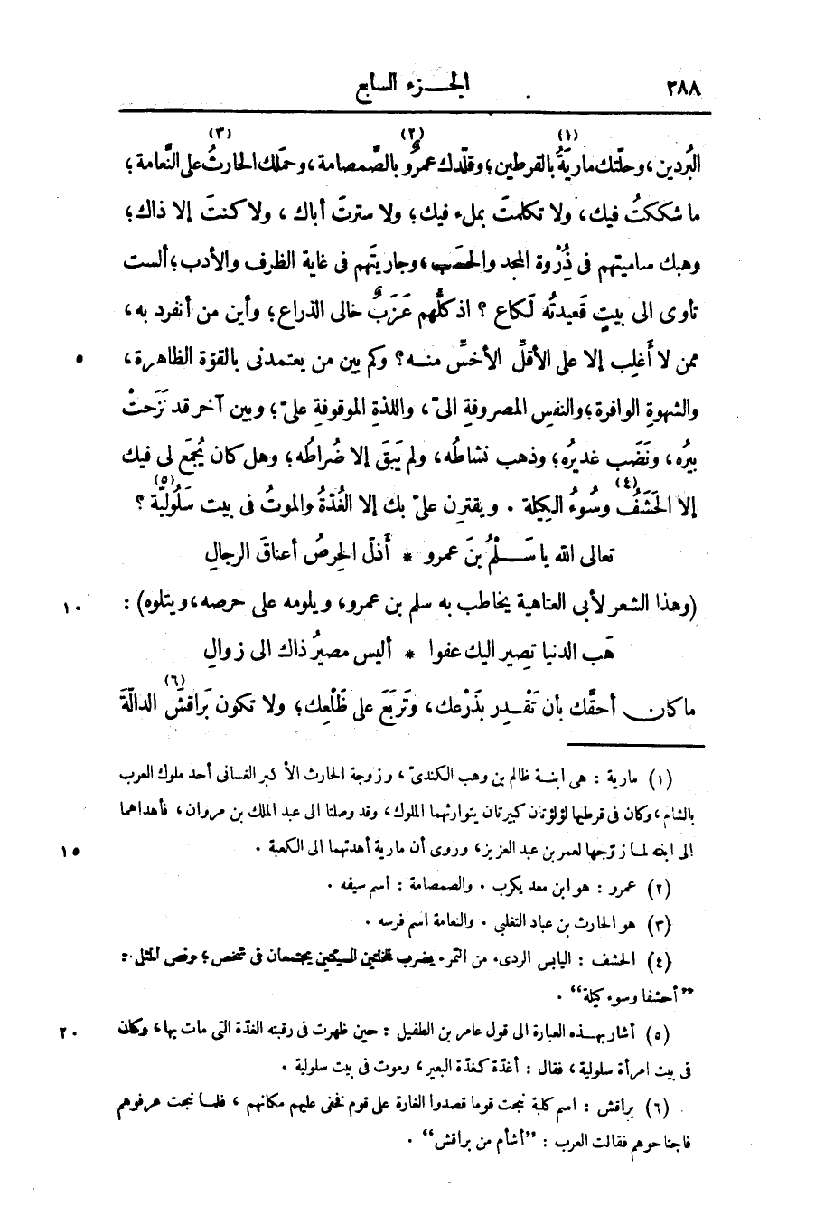 البردين، وحلّتك مارية «1» بالقرطين؛ وقلّدك عمرو «2» بالصّمصامة، وحملك الحارث «3» على النّعامة؛ ما شككت فيك، ولا تكلمت بملء فيك؛ ولا سترت أباك، ولا كنت إلا ذاك؛ وهبك ساميتهم فى ذروة المجد والحسب، وجاريتهم فى غاية الظرف والأدب؛ ألست تأوى الى بيت قعيدته لكاع؟ اذ كلّهم عزب خالى الذراع؛ وأين من أنفرد به، ممن لا أغلب إلا على الأقلّ الأخسّ منه؟ وكم بين من يعتمدنى بالقوّة الظاهرة، والشهوة الوافرة؛ والنفس المصروفة الىّ، واللذة الموقوفة علىّ؛ وبين آخر قد نزحت بيره، ونضب غديره؛ وذهب نشاطه، ولم يبق إلا ضراطه؛ وهل كان يجمع لى فيك إلا الحشف «4» وسوء الكيلة. ويقترن علىّ بك إلا الغدّة والموت فى بيت سلوليّة «5» ؟