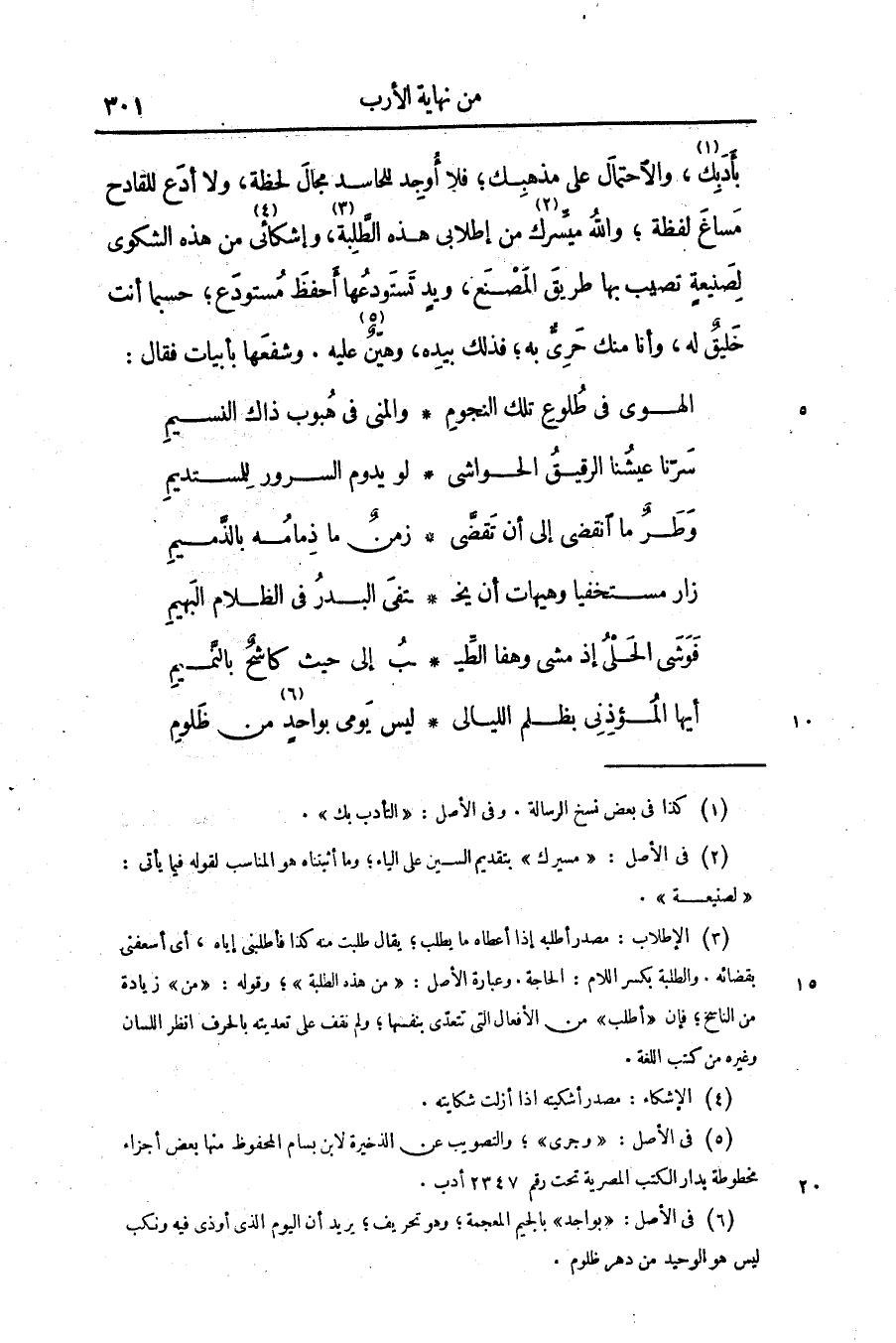 بأدبك «1» ، والاحتمال على مذهبك؛ فلا أوجد للحاسد مجال لحظة، ولا أدع للقادح مساغ لفظة؛ والله ميسّرك «2» من إطلابى هذه الطّلبة «3» ، وإشكائى «4» من هذه الشكوى لصنيعة تصيب بها طريق المصنع، ويد تستودعها أحفظ مستودع؛ حسبما أنت خليق له، وأنا منك حرىّ به؛ فذلك بيده، وهيّن «5» عليه. وشفعها بأبيات فقال: