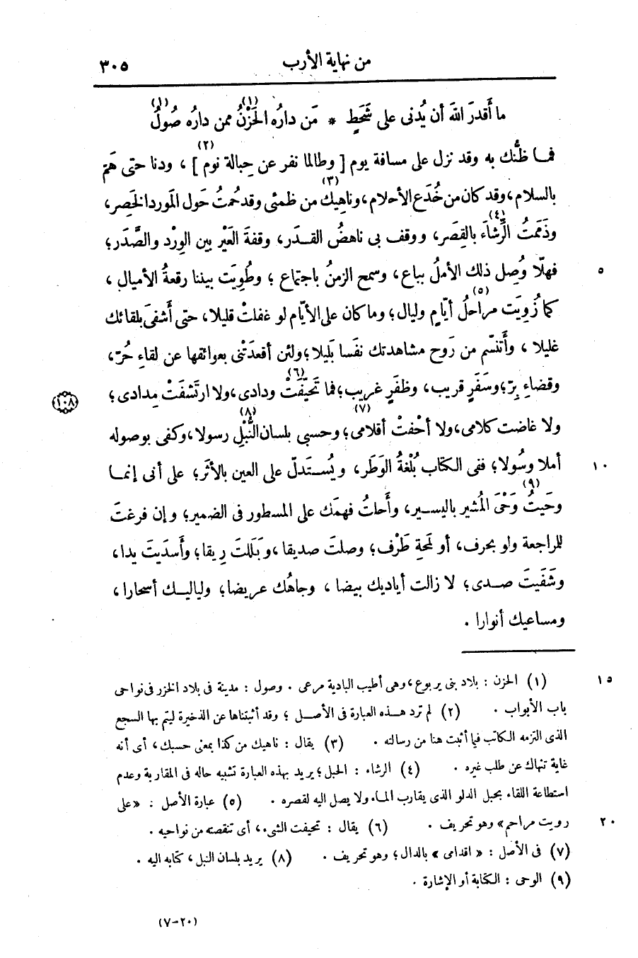 فما ظنّك به وقد نزل على مسافة يوم [وطالما نفر عن حبالة نوم «2» ] ، ودنا حتى همّ بالسلام، وقد كان من خدع الأحلام، وناهيك «3» من ظمئى وقد حمت حول المورد الخصر، وذممت الرّشاء «4» بالقصر، ووقف بى ناهض القدر، وقفة العير بين الورد والصّدر؛ فهلّا وصل ذلك الأمل بباع، وسمح الزمن باجتماع؛ وطويت بيننا رقعة الأميال، كما زويت مراحل «5» أيّام وليال؛ وما كان على الأيّام لو غفلت قليلا، حتى أشفى بلقائك غليلا، وأتنسّم من روح مشاهدتك نفسا بليلا؛ ولئن أقعدتنى بعوائقها عن لقاء حرّ، وقضاء برّ؛ وسفر قريب، وظفر غريب؛ فما تحيّفت «6» ودادى، ولا ارتشفت مدادى؛ ولا غاضت كلامى، ولا أحفت أقلامى «7» ؛ وحسبى بلسان النّبل «8» رسولا، وكفى بوصوله أملا وسولا؛ ففى الكتاب بلغة الوطر، ويستدلّ على العين بالأثر؛ على أنى إنما وحيت «9» وحى المشير باليسير، وأحلت فهمك على المسطور فى الضمير؛ وإن فرغت للمراجعة ولو بحرف، أو لمحة طرف؛ وصلت صديقا، وبللت ريقا؛ وأسديت يدا، وشفيت صدى؛ لا زالت أياديك بيضا، وجاهك عريضا؛ ولياليك أسحارا، ومساعيك أنوارا.