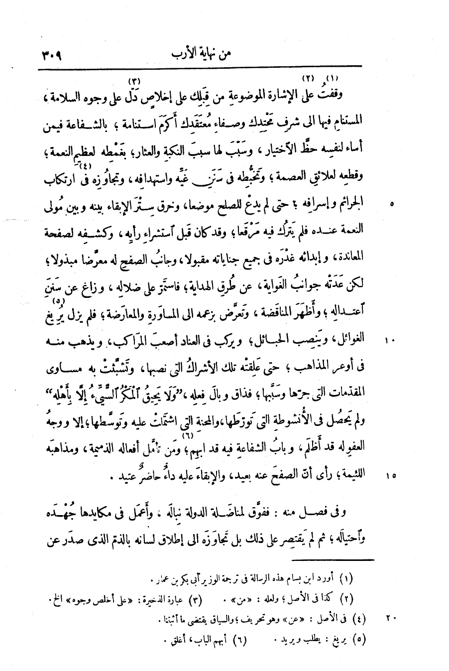 وفى فصل منه: ففوّق لمناضلة الدولة نباله، وأعمل فى مكايدها جهده واحتياله؛ ثم لم يقتصر على ذلك بل تجاوزه الى إطلاق لسانه بالذمّ الذى صدر عن
