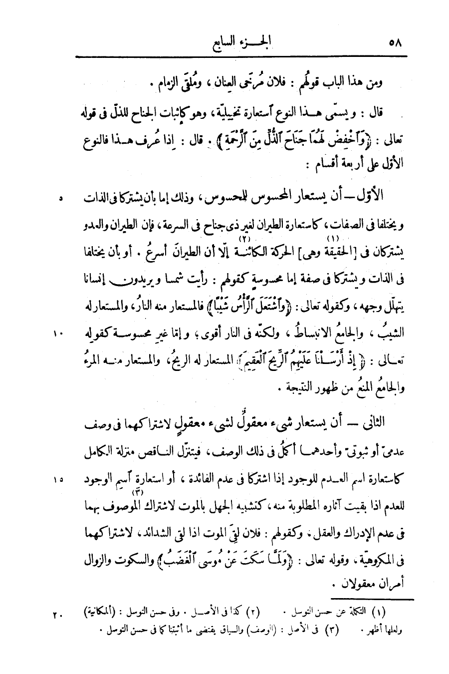 فالمستعار منه النار، والمستعار له الشيب، والجامع الانبساط، ولكنّه فى النار أقوى؛ وإمّا غير محسوسة كقوله تعالى: إِذْ أَرْسَلْنا عَلَيْهِمُ الرِّيحَ الْعَقِيمَ