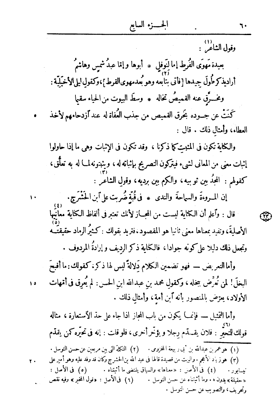 قال: واعلم أن الكناية ليست من المجاز لأنك تعتبر فى ألفاظ الكناية معانيها «4» الأصلية، وتفيد بمعناها معنى ثانيا هو المقصود، فتريد بقولك: كثير الرماد حقيقته «5» وتجعل ذلك دليلا على كونه جوادا، فالكناية ذكر الرديف وإرادة المردوف.