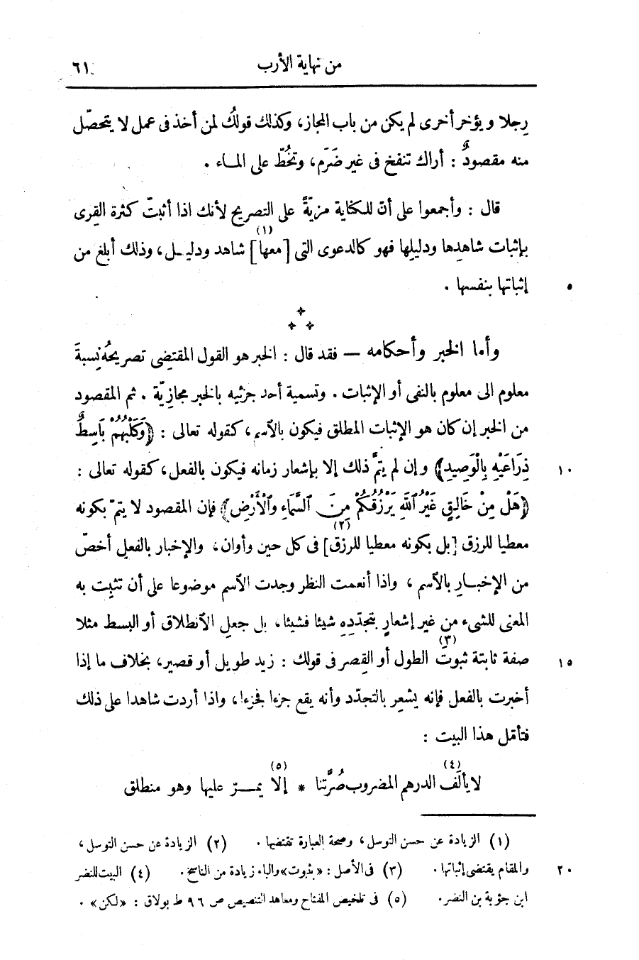 - فقد قال: الخبر هو القول المقتضى تصريحه نسبة معلوم الى معلوم بالنفى أو الإثبات. وتسمية أحد جزئيه بالخبر مجازيّة. ثم المقصود من الخبر إن كان هو الإثبات المطلق فيكون بالاسم، كقوله تعالى: وَكَلْبُهُمْ باسِطٌ ذِراعَيْهِ بِالْوَصِيدِ