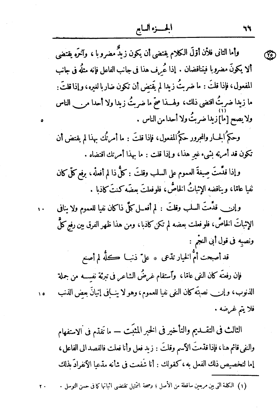 وأما الثانى فلأن أوّل الكلام يقتضى أن يكون زيد مضروبا، وآخره يقتضى ألا يكون مضروبا فيتناقضان. إذا عرف هذا فى جانب الفاعل فإنه مثله فى جانب المفعول، فإذا قلت: ما ضربت زيدا لم يقتض أن تكون ضاربا لغيره، وإذا قلت: