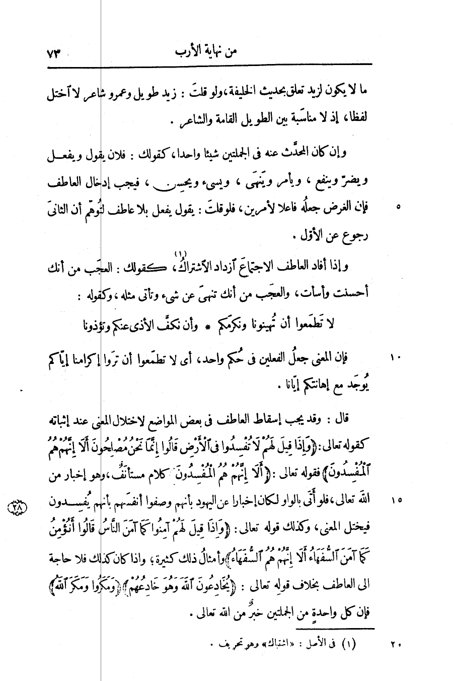قال: وقد يجب إسقاط العاطف فى بعض المواضع لاختلال المعنى عند إثباته كقوله تعالى: وَإِذا قِيلَ لَهُمْ لا تُفْسِدُوا فِي الْأَرْضِ قالُوا إِنَّما نَحْنُ مُصْلِحُونَ أَلا إِنَّهُمْ هُمُ الْمُفْسِدُونَ