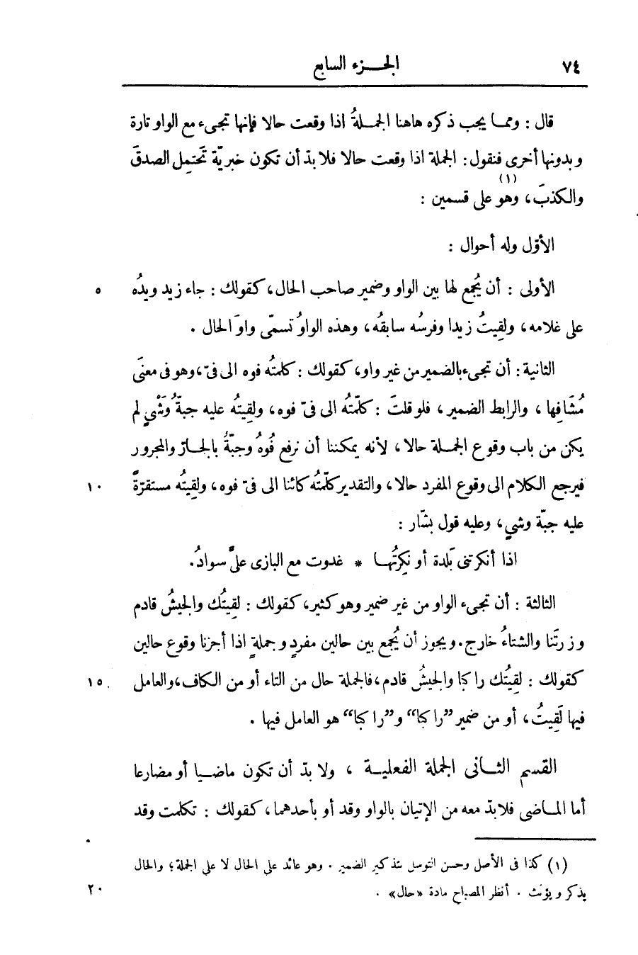 قال: ومما يجب ذكره هاهنا الجملة اذا وقعت حالا فإنها تجىء مع الواو تارة وبدونها أخرى فنقول: الجملة اذا وقعت حالا فلا بدّ أن تكون خبريّة تحتمل الصدق والكذب، وهو «1» على قسمين:
