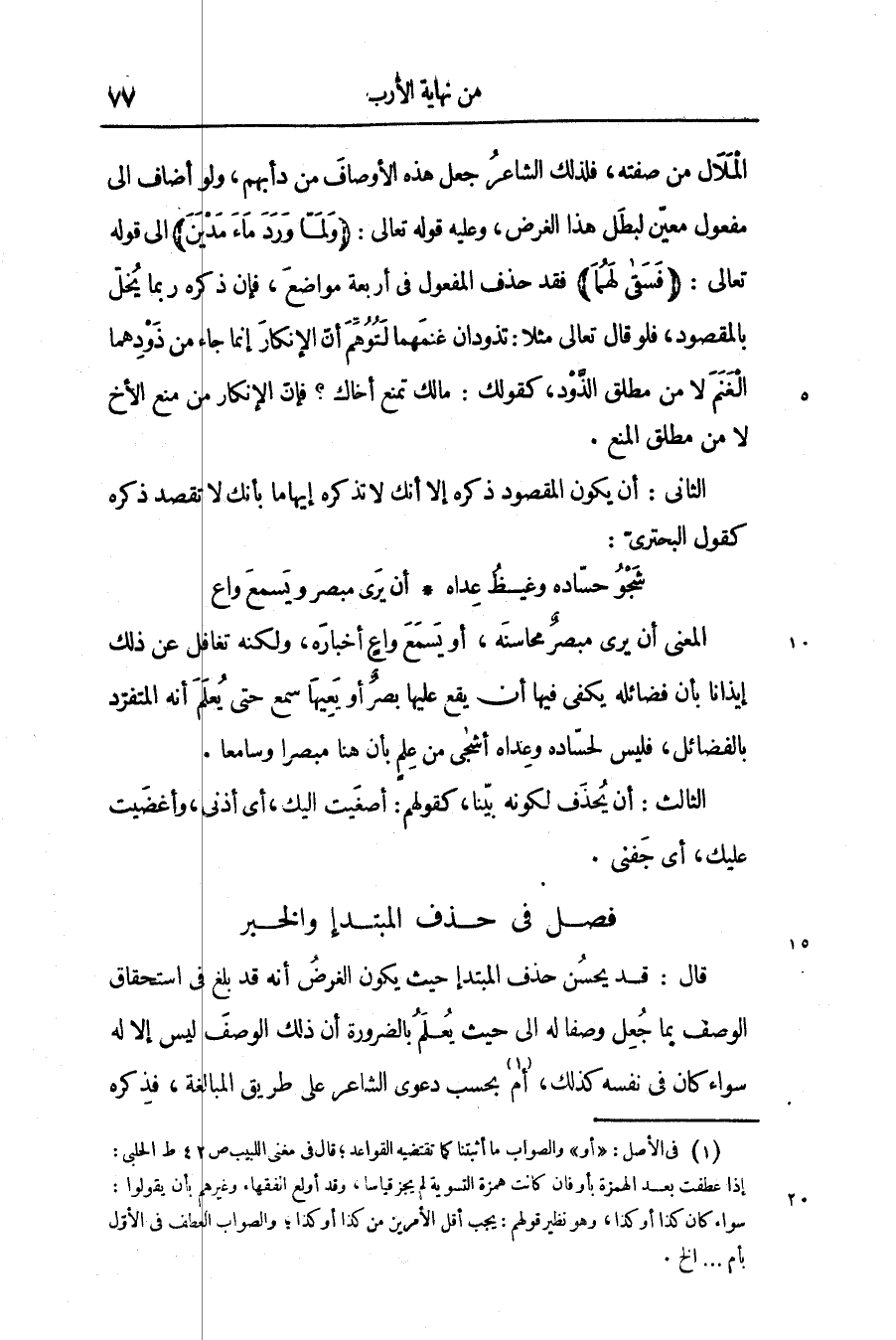 قال: قد يحسن حذف المبتدإ حيث يكون الغرض أنه قد بلغ فى استحقاق الوصف بما جعل وصفا له الى حيث يعلم بالضرورة أن ذلك الوصف ليس إلا له سواء كان فى نفسه كذلك، أم «1» بحسب دعوى الشاعر على طريق المبالغة، فذكره