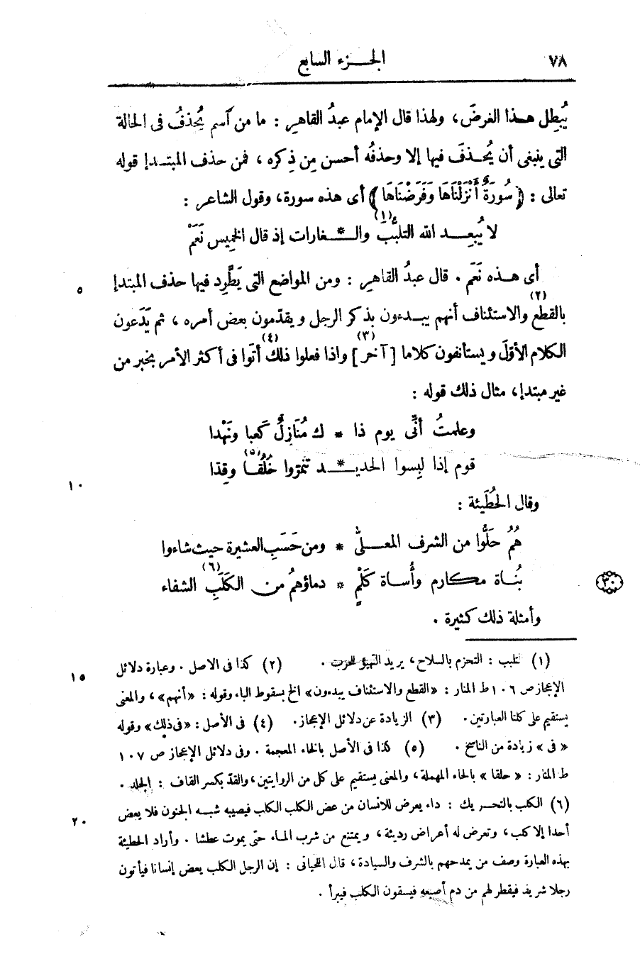 أى هذه نعم، قال عبد القاهر: ومن المواضع التى يطّرد فيها حذف المبتدإ بالقطع «2» والاستئناف أنهم يبدعون بذكر الرجل ويقدّمون بعض أمره، ثم يدعون الكلام الأوّل ويستأنفون كلاما [آخر «3» ] واذا فعلوا ذلك «4» أتوا فى أكثر الأمر بخبر من غير مبتدإ، مثال ذلك قوله: