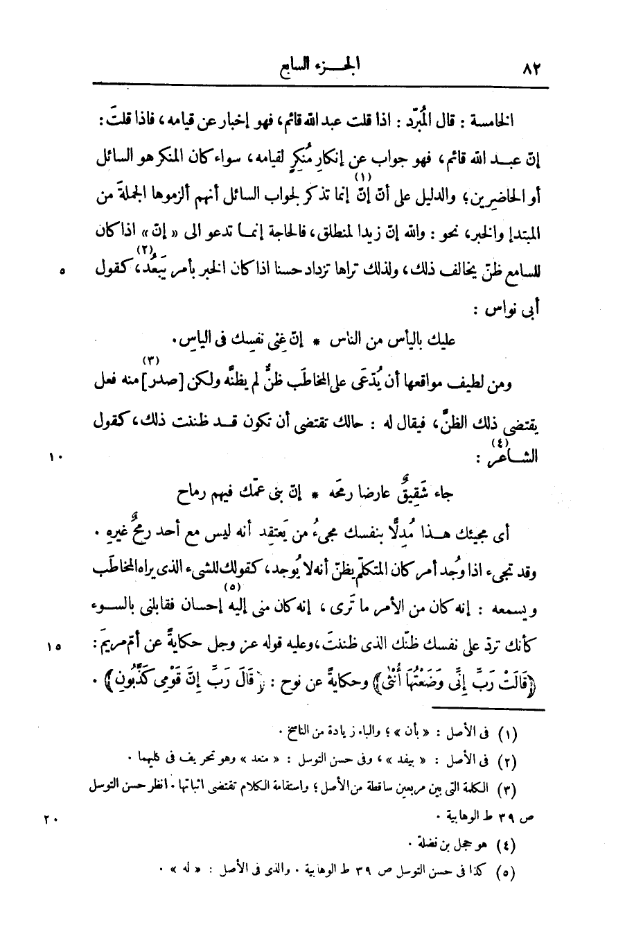 إنّ عبد الله قائم، فهو جواب عن إنكار منكر لقيامه، سواء كان المنكر هو السائل أو الحاضرين؛ والدليل على أنّ إنّ «1» إنما تذكر لجواب السائل أنهم ألزموها الجملة من المبتدإ والخبر، نحو: والله إنّ زيدا لمنطلق، فالحاجة إنما تدعو الى «إنّ» اذا كان للسامع ظنّ يخالف ذلك، ولذلك تراها تزداد حسنا اذا كان الخبر بأمر يبعد «2» ، كقول أبى نواس: