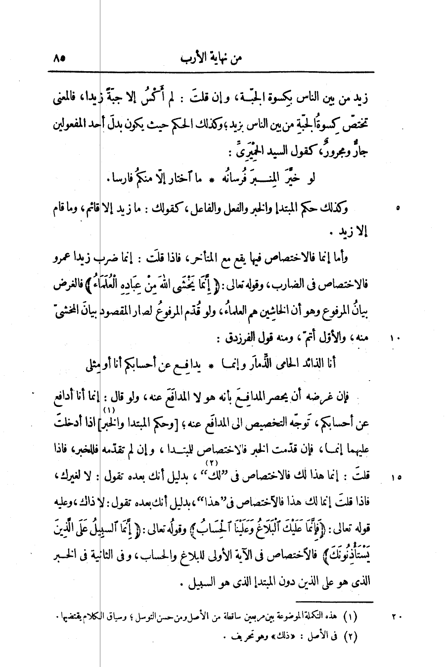 فإن غرضه أن يحصر المدافع بأنه هو لا المدافع عنه؛ ولو قال: إنما أنا أدافع عن أحسابكم، توجّه التخصيص الى المدافع عنه؛ [وحكم المبتدا والخبر «1» ] اذا أدخلت عليهما إنما، فإن قدّمت الخبر فالاختصاص للمبتدا، وإن لم تقدّمه فللخبر، فاذا قلت: إنما هذا لك فالاختصاص فى «لك «2» » ، بدليل أنك بعده تقول: لا لغيرك، فاذا قلت إنما لك هذا فالاختصاص فى «هذا» ، بدليل أنك بعده تقول: لا ذاك، وعليه قوله تعالى: فَإِنَّما عَلَيْكَ الْبَلاغُ وَعَلَيْنَا الْحِسابُ