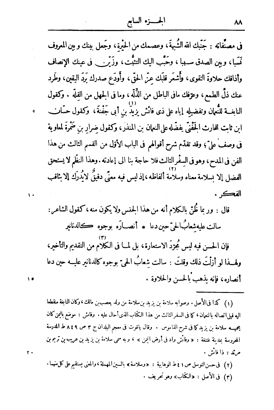 فى مصنّفاته: جنّبك الله الشبهة، وعصمك من الحيرة، وجعل بينك وبين المعروف نسبا، وبين الصدق سببا، وحبّب اليك التثبّت، وزيّن فى عينك الإنصاف وأذاقك حلاوة التقوى، وأشعر قلبك عزّ الحقّ، وأودع صدرك برد اليقين، وطرد عنك ذلّ الطمع، وعرّفك ما فى الباطل من الذّلة، وما فى الجهل من القلّة. وكقول النابغة للنّعمان وتفضيله إياه على ذى فائش يزيد «1» بن أبى جفنة، وكقول حسّان ابن ثابت للحارث الجفنّى يفضّله على النعمان بن المنذر، وكقول ضرار بن ضمرة لمعاوية فى وصف علىّ؛ وقد تقدّم شرح أقوالهم فى الباب الأوّل من القسم الثالث من هذا الفن فى المدح، وهو فى السفر الثالث فلا حاجة بنا الى إعادته. وهذا النظم لا يستحق الفضل إلا بسلامة معناه وسلامة «2» ألفاظه، إذ ليس فيه معنى دقيق لا يدرك إلا بثاقب الفكر.