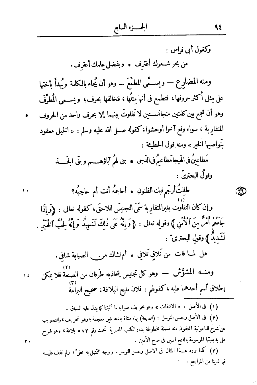 - ويسمّى المطمّع- وهو أن يجاء بالكلمة ويبدأ بأختها على مثل أكثر حروفها، فتطمع فى أنها مثلها، فتخالفها بحرف؛ ويسمى المطرّف وهو أن تجمع بين كلمتين متجانستين لا تفاوت بينهما إلا بحرف واحد من الحروف المتقاربة، سواء وقع آخرا أوحشوا، كقوله صلّى الله عليه وسلم: «الخيل معقود بنواصيها الخير» ومنه قول الحطيئة: