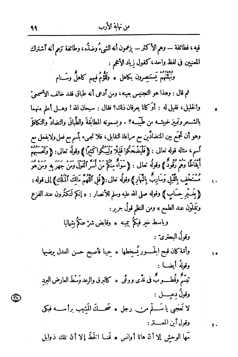 فيه، فطائفة- وهم الأكثر- يزعمون أنه الشىء وضدّه، وطائفة تزعم أنه اشتراك المعنيين فى لفظ واحد، كقول زياد الأعجم:
