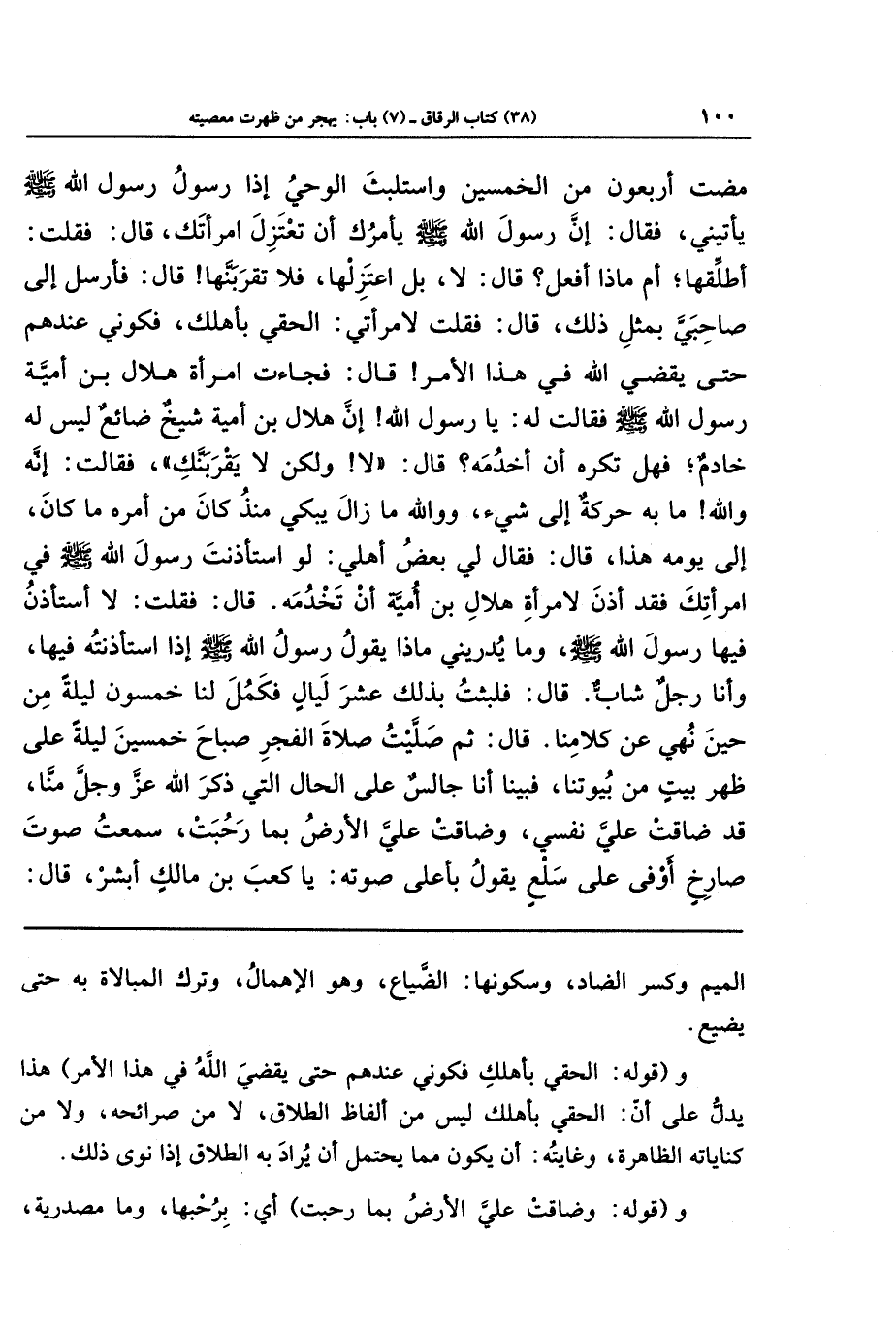مَضَت أَربَعُونَ مِن الخَمسِينَ، وَاستَلبَثَ الوَحيُ، إِذَا رَسُولُ رَسُولِ اللَّهِ صَلَّى اللَّهُ عَلَيهِ وَسَلَّمَ يَأتِينِي، فَقَالَ: إِنَّ رَسُولَ اللَّهِ صَلَّى اللَّهُ عَلَيهِ وَسَلَّمَ يَأمُرُكَ أَن تَعتَزِلَ امرَأَتَكَ، قَالَ: فَقُلتُ: أُطَلِّقُهَا أَم مَاذَا أَفعَلُ؟ قَالَ: لَا، بَل اعتَزِلهَا فَلَا تَقرَبَنَّهَا، قَالَ: فَأَرسَلَ إِلَى صَاحِبَيَّ بِمِثلِ ذَلِكَ، قَالَ: فَقُلتُ لِامرَأَتِي: الحَقِي بِأَهلِكِ فَكُونِي عِندَهُم حَتَّى يَقضِيَ اللَّهُ فِي هَذَا الأَمرِ، قَالَ: فَجَاءَت امرَأَةُ هِلَالِ بنِ أُمَيَّةَ رَسُولَ اللَّهِ صَلَّى اللَّهُ عَلَيهِ وَسَلَّمَ فَقَالَت لَهُ: يَا رَسُولَ اللَّهِ، إِنَّ هِلَالَ بنَ أُمَيَّةَ شَيخٌ ضَائِعٌ لَيسَ لَهُ خَادِمٌ، فَهَل تَكرَهُ أَن أَخدُمَهُ؟ قَالَ: لَا، وَلَكِن لَا يَقرَبَنَّكِ، فَقَالَت: إِنَّهُ وَاللَّهِ مَا بِهِ حَرَكَةٌ إِلَى شَيءٍ، وَوَاللَّهِ مَا زَالَ يَبكِي مُنذُ كَانَ مِن أَمرِهِ مَا كَانَ إِلَى يَومِهِ هَذَا.