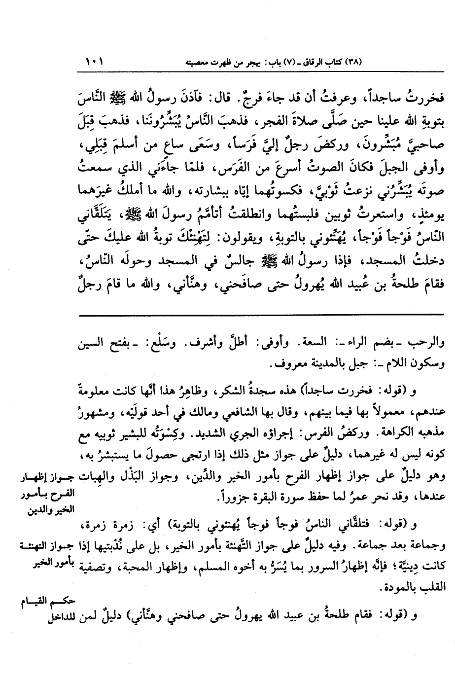 قَالَ: فَآذَنَ رَسُولُ اللَّهِ صَلَّى اللَّهُ عَلَيهِ وَسَلَّمَ النَّاسَ بِتَوبَةِ اللَّهِ عَلَينَا حِينَ صَلَّى صَلَاةَ الفَجرِ، فَذَهَبَ النَّاسُ يُبَشِّرُونَنَا، فَذَهَبَ قِبَلَ صَاحِبَيَّ مُبَشِّرُونَ، وَرَكَضَ رَجُلٌ إِلَيَّ فَرَسًا، وَسَعَى سَاعٍ مِن أَسلَمَ قِبَلِي وَأَوفَى الجَبَلَ، فَكَانَ الصَّوتُ أَسرَعَ مِن الفَرَسِ، فَلَمَّا جَاءَنِي الَّذِي سَمِعتُ صَوتَهُ يُبَشِّرُنِي نَزَعتُ ثَوبَيَّ، فَكَسَوتُهُمَا إِيَّاهُ بِبِشَارَتِهِ، وَاللَّهِ مَا أَملِكُ غَيرَهُمَا يَومَئِذٍ، وَاستَعَرتُ ثَوبَينِ فَلَبِستُهُمَا، وَانطَلَقتُ أَتَأَمَّمُ رَسُولَ اللَّهِ صَلَّى اللَّهُ عَلَيهِ وَسَلَّمَ يَتَلَقَّانِي النَّاسُ فَوجًا فَوجًا، يُهَنِّئُونِي بِالتَّوبَةِ وَيَقُولُونَ: لِتَهنِئكَ تَوبَةُ اللَّهِ عَلَيكَ، حَتَّى دَخَلتُ المَسجِدَ، فَإِذَا رَسُولُ اللَّهِ صَلَّى اللَّهُ عَلَيهِ وَسَلَّمَ جَالِسٌ فِي المَسجِدِ وَحَولَهُ النَّاسُ، فَقَامَ طَلحَةُ بنُ عُبَيدِ اللَّهِ يُهَروِلُ حَتَّى صَافَحَنِي وَهَنَّأَنِي، وَاللَّهِ مَا قَامَ رَجُلٌ