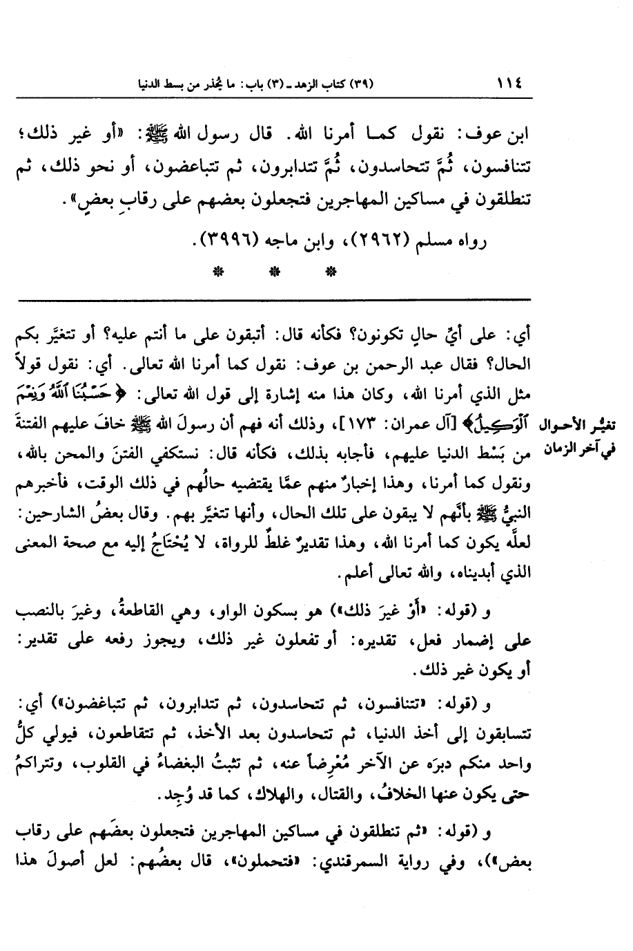 بنُ عَوفٍ: نَقُولُ كَمَا أَمَرَنَا اللَّهُ، قَالَ رَسُولُ اللَّهِ صَلَّى اللَّهُ عَلَيهِ وَسَلَّمَ: أَو غَيرَ ذَلِكَ، تَتَنَافَسُونَ ثُمَّ تَتَحَاسَدُونَ، ثُمَّ تَتَدَابَرُونَ، ثُمَّ تَتَبَاغَضُونَ، أَو نَحوَ ذَلِكَ. ثُمَّ تَنطَلِقُونَ فِي مَسَاكِينِ المُهَاجِرِينَ فَتَجعَلُونَ بَعضَهُم عَلَى رِقَابِ بَعضٍ.