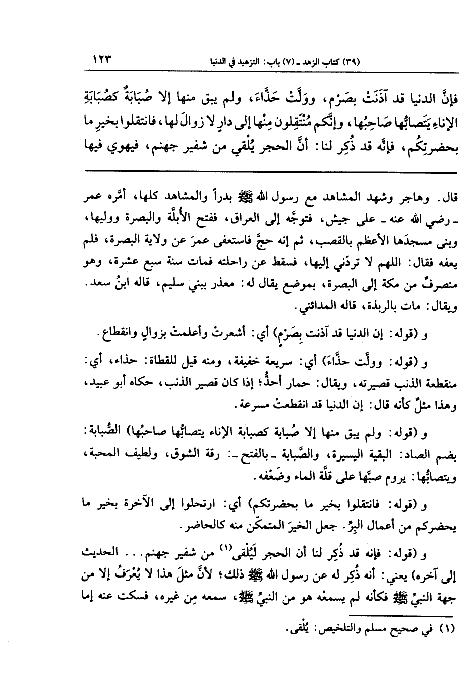 فَإِنَّ الدُّنيَا قَد آذَنَت بِصَرمٍ وَوَلَّت حَذَّاءَ، وَلَم يَبقَ مِنهَا إِلَّا صُبَابَةٌ كَصُبَابَةِ الإِنَاءِ يَتَصَابُّهَا صَاحِبُهَا، وَإِنَّكُم مُنتَقِلُونَ مِنهَا إِلَى دَارٍ لَا زَوَالَ لَهَا، فَانتَقِلُوا بِخَيرِ مَا بِحَضرَتِكُم، فَإِنَّهُ قَد ذُكِرَ لَنَا أَنَّ الحَجَرَ يُلقَى مِن شَفير جَهَنَّمَ، فَيَهوِي فِيهَا