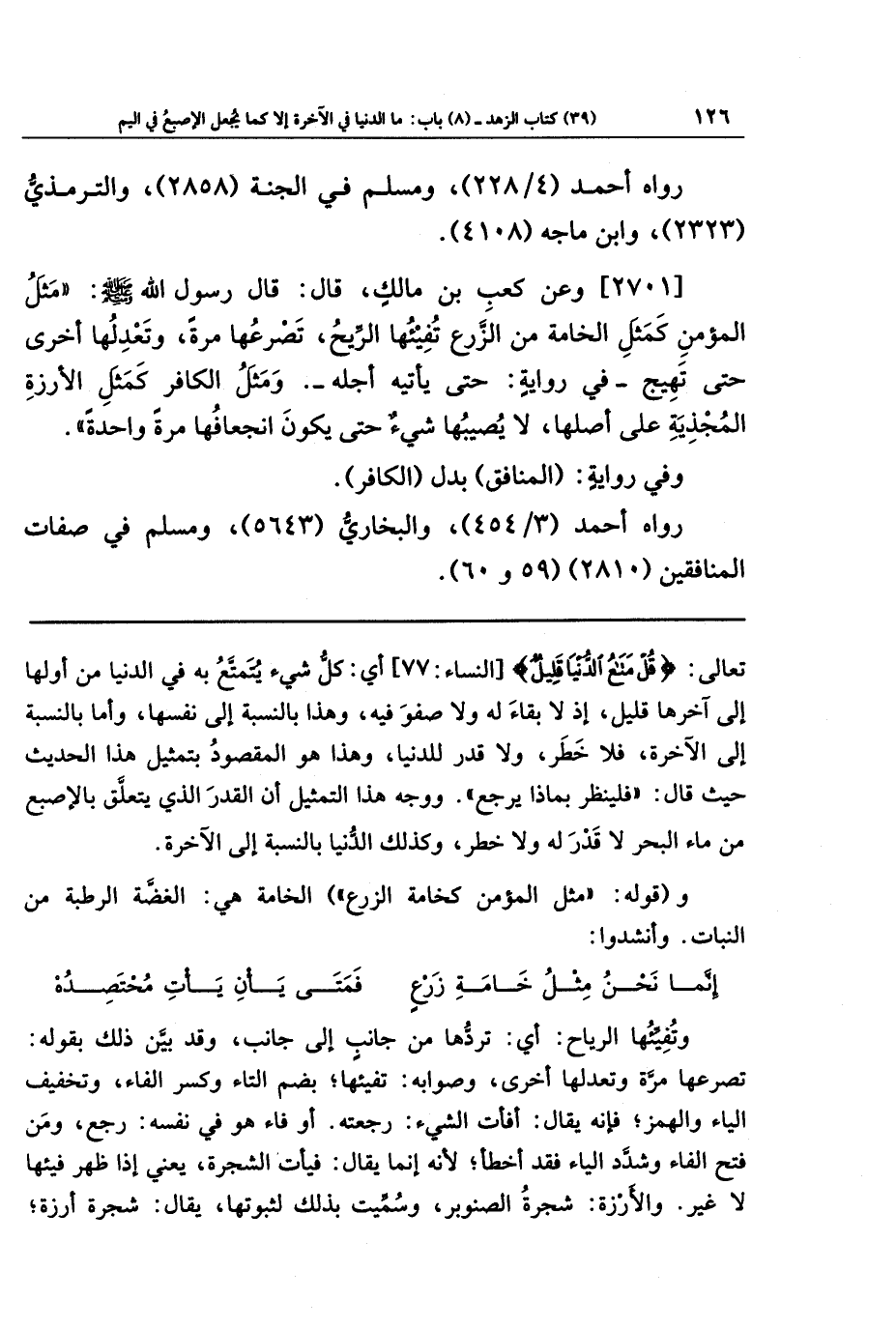 [2701] وعن كعب بن مالك، قال: قَالَ رَسُولُ اللَّهِ صَلَّى اللَّهُ عَلَيهِ وَسَلَّمَ: مَثَلُ المُؤمِنِ كَمَثَلِ الخَامَةِ مِن الزَّرعِ، تُفِيئُهَا الرِّيحُ، تَصرَعُهَا مَرَّةً وَتَعدِلُهَا أُخرَى، حَتَّى تَهِيجَ - في رواية: حتى يأتيه أجله - وَمَثَلُ الكَافِرِ كَمَثَلِ الأَرزَةِ المُجذِيَةِ عَلَى أَصلِهَا، لَا يُصيبهَا شَيءٌ حَتَّى يَكُونَ انجِعَافُهَا مَرَّةً وَاحِدَةً.