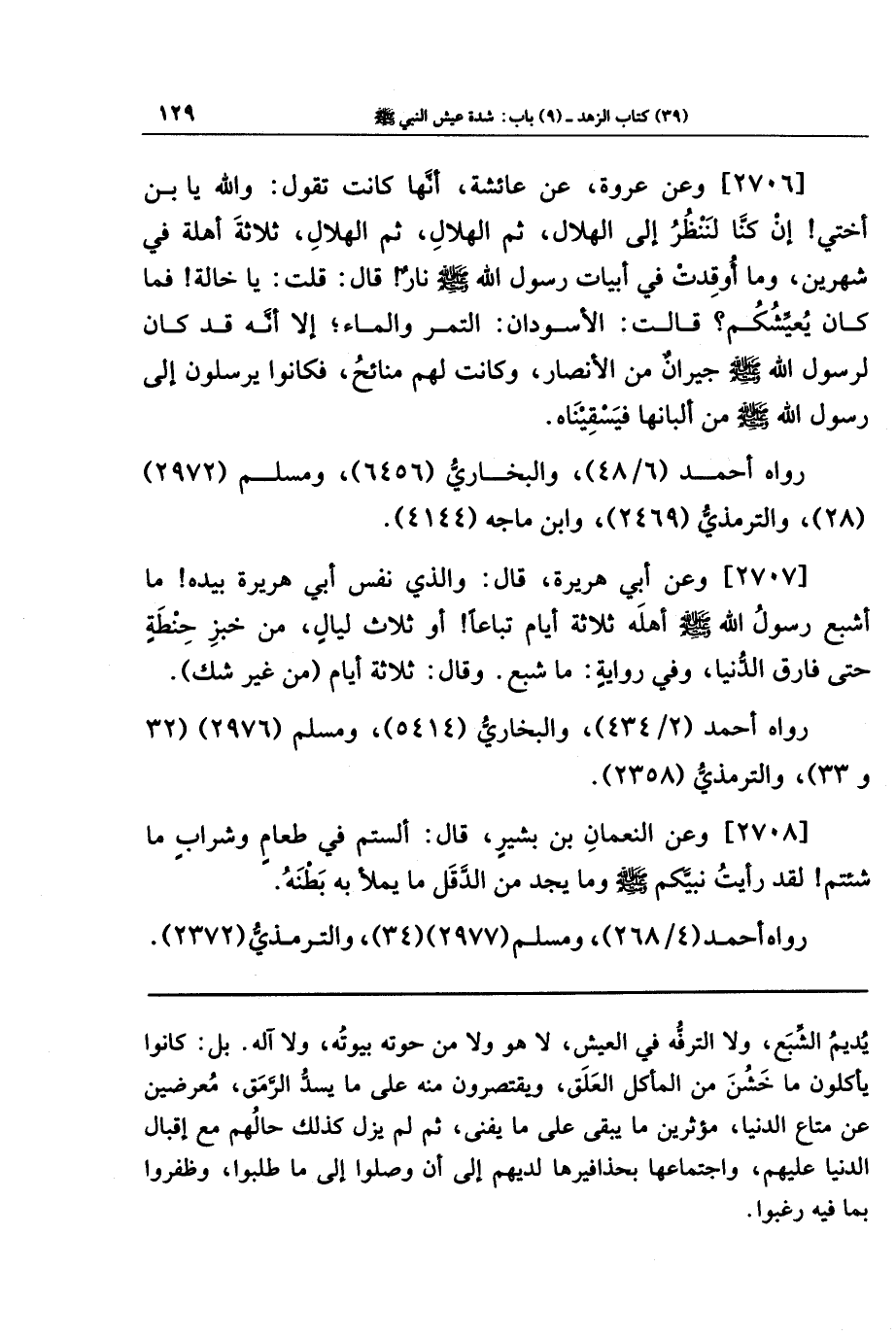 [2706] وعَن عُروَةَ عَن عَائِشَةَ، أَنَّهَا كَانَت تَقُولُ: وَاللَّهِ يَا بنَ أُختِي، إِن كُنَّا لَنَنظُرُ إِلَى الهِلَالِ ثُمَّ الهِلَالِ ثُمَّ الهِلَالِ، ثَلَاثَةَ أَهِلَّةٍ فِي شَهرَينِ، وَمَا أُوقِدَ فِي أَبيَاتِ رَسُولِ اللَّهِ صَلَّى اللَّهُ عَلَيهِ وَسَلَّمَ نَارٌ، قَالَ: قُلتُ: يَا خَالَةُ فَمَا كَانَ يُعَيِّشُكُم؟ قَالَت: الأَسوَدَانِ؛ التَّمرُ وَالمَاءُ، إِلَّا أَنَّهُ قَد كَانَ لِرَسُولِ اللَّهِ صَلَّى اللَّهُ عَلَيهِ وَسَلَّمَ جِيرَانٌ مِن الأَنصَارِ، وَكَانَت لَهُم مَنَائِحُ، فَكَانُوا يُرسِلُونَ إِلَى رَسُولِ اللَّهِ صَلَّى اللَّهُ عَلَيهِ وَسَلَّمَ مِن أَلبَانِهَا فَيَسقِينَاهُ.