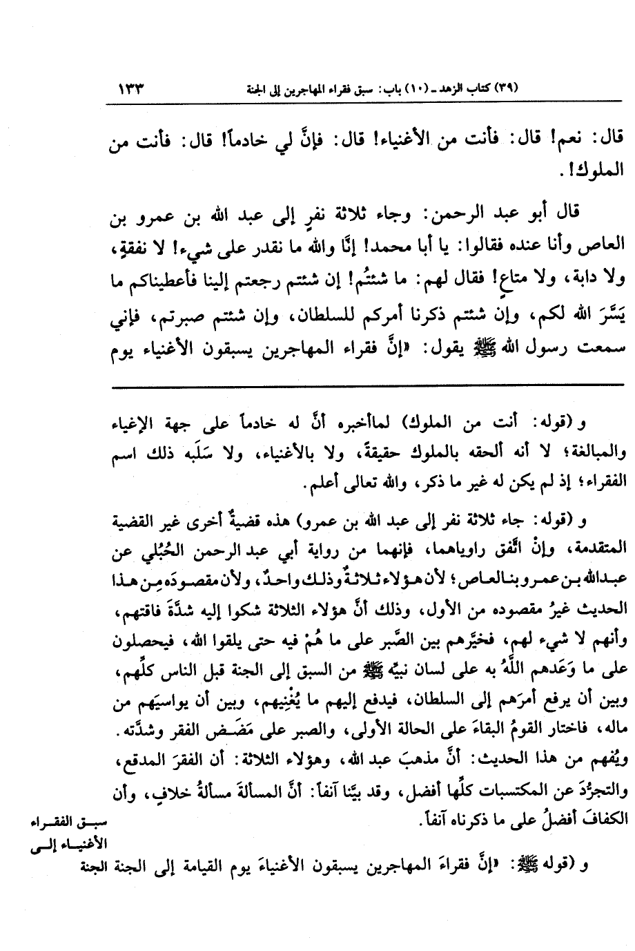 قَالَ أَبُو عَبدِ الرَّحمَنِ: وَجَاءَ ثَلَاثَةُ نَفَرٍ إِلَى عَبدِ اللَّهِ بنِ عَمرِو بنِ العَاصِ وَأَنَا عِندَهُ فَقَالُوا: يَا أَبَا مُحَمَّدٍ، إِنَّا وَاللَّهِ مَا نَقدِرُ عَلَى شَيءٍ، لَا نَفَقَةٍ وَلَا دَابَّةٍ وَلَا مَتَاعٍ، فَقَالَ لَهُم: مَا شِئتُم، إِن شِئتُم رَجَعتُم إِلَينَا فَأَعطَينَاكُم مَا يَسَّرَ الَّهُ لَكُم، وَإِن شِئتُم ذَكَرنَا أَمرَكُم لِلسُّلطَانِ، وَإِن شِئتُم صَبَرتُم فَإِنِّي سَمِعتُ رَسُولَ اللَّهِ صَلَّى اللَّهُ عَلَيهِ وَسَلَّمَ يَقُولُ: إِنَّ فُقَرَاءَ المُهَاجِرِينَ يَسبِقُونَ الأَغنِيَاءَ يَومَ