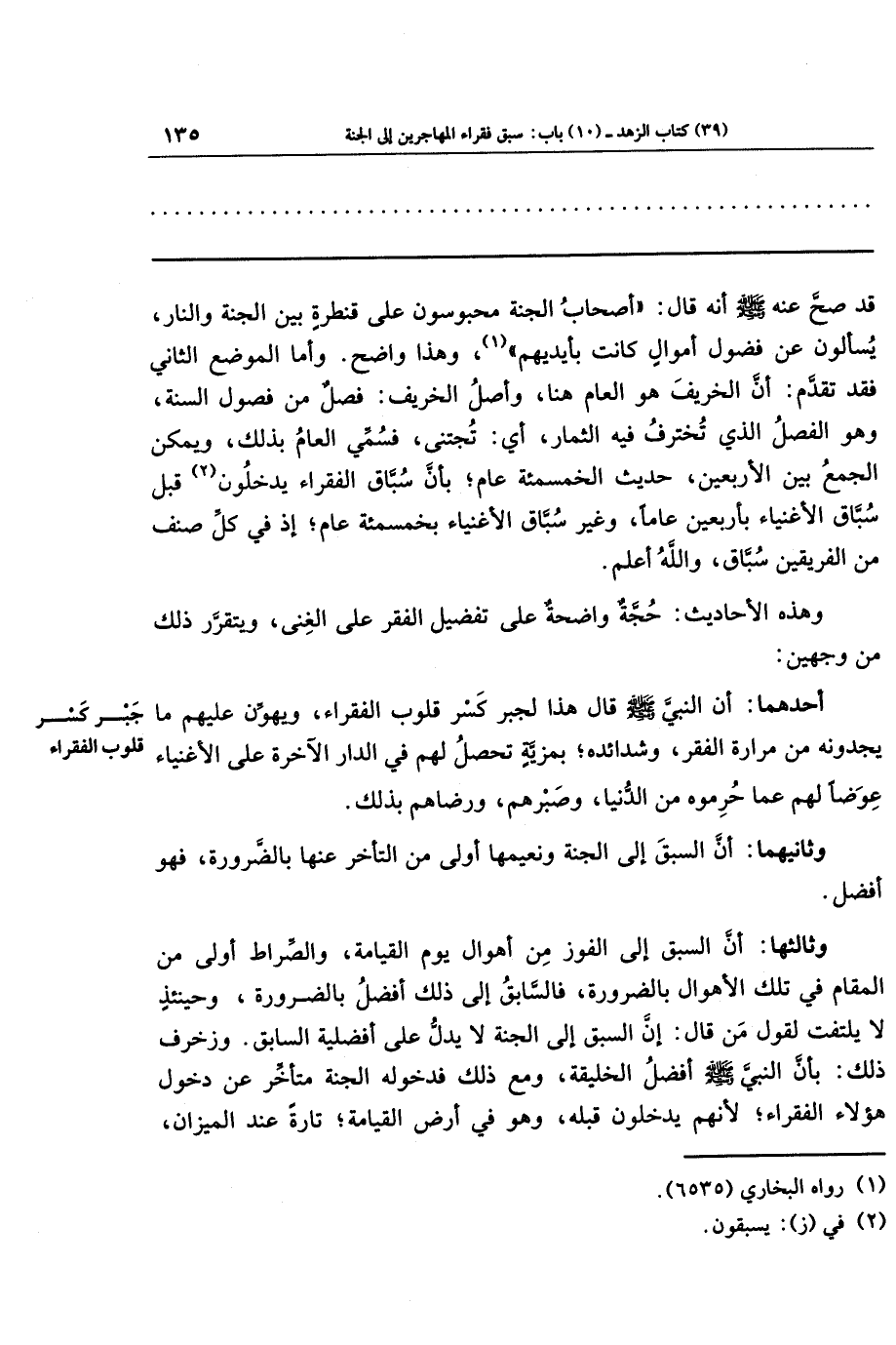 قد صح عنه صلى الله عليه وسلم أنه قال: أصحاب الجد محبوسون على قنطرة بين الجنة والنار، يُسألون عن فضول أموال كانت بأيديهم (¬1)، وهذا واضح. وأما الموضع الثاني فقد تقدَّم: أن الخريف هو العام هنا، وأصل الخريف: فصل من فصول السنة، وهو الفصل الذي تخترف فيه الثمار، أي: تُجتنى، فسمي العام بذلك، ويمكن الجمع بين الأربعين وحديث الخمسمائة عام؛ بأن سباق الفقراء يدخلون (¬2) قبل سباق الأغنياء بأربعين عاما، وغير سباق الأغنياء بخمسمائة عام؛ إذ في كل صنف من الفريقين سباق، والله أعلم.