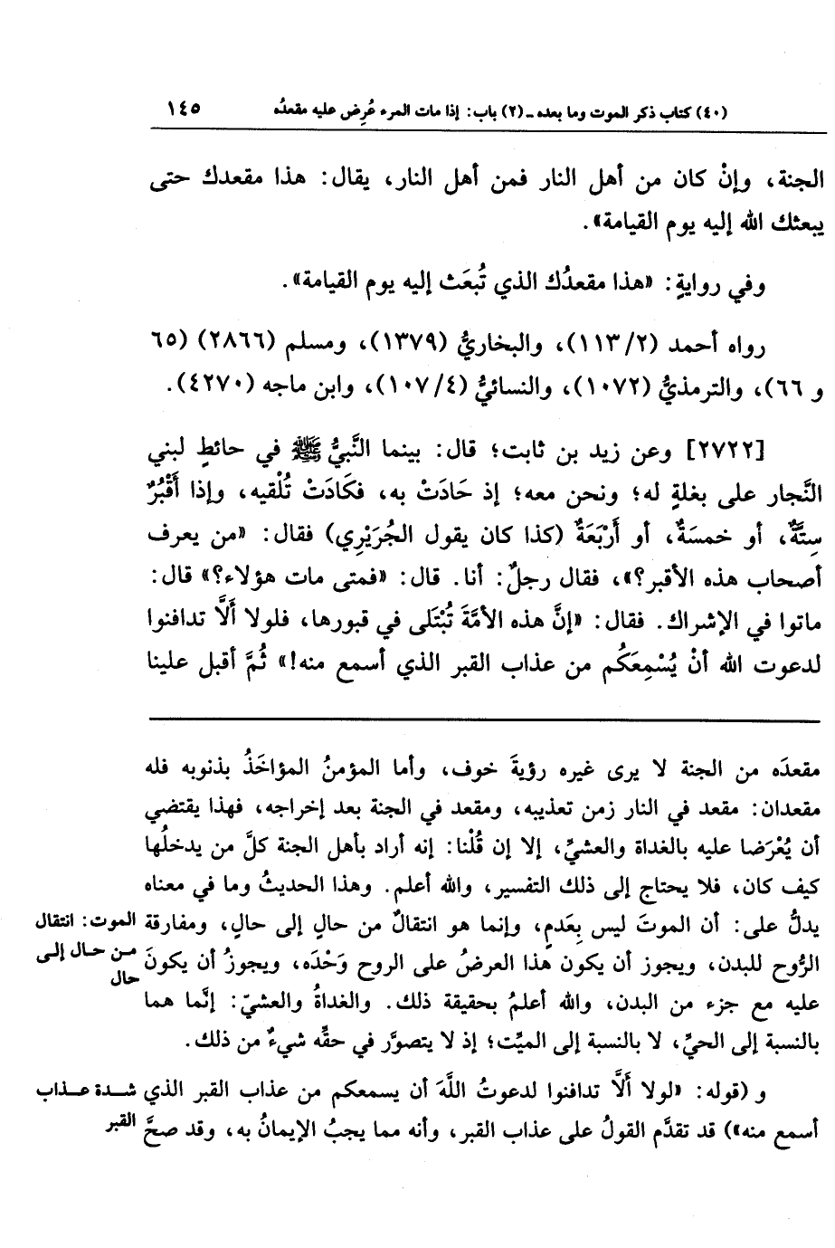 [2722] وعن زيد بن ثابت؛ قال: بَينَمَا النَّبِيُّ صَلَّى اللَّهُ عَلَيهِ وَسَلَّمَ فِي حَائِطٍ لِبَنِي النَّجَّارِ عَلَى بَغلَةٍ لَهُ، وَنَحنُ مَعَهُ؛ إِذ حَادَت بِهِ فَكَادَت تُلقِيهِ، وَإِذَا أَقبُرٌ سِتَّةٌ أَو خَمسَةٌ أَو أَربَعَةٌ (كَذَا كَانَ يَقُولُ الجُرَيرِيُّ) فَقَالَ: مَن يَعرِفُ أَصحَابَ هَذِهِ الأَقبُرِ؟ فَقَالَ رَجُلٌ: أَنَا، قَالَ: فَمَتَى مَاتَ هَؤُلَاءِ؟ قَالَ: مَاتُوا فِي الإِشرَاكِ، فَقَالَ: إِنَّ هَذِهِ الأُمَّةَ تُبتَلَى فِي قُبُورِهَا، فَلَولَا أَلا تَدَافَنُوا لَدَعَوتُ اللَّهَ أَن يُسمِعَكُم مِن عَذَابِ القَبرِ الَّذِي أَسمَعُ مِنهُ. ثُمَّ أَقبَلَ عَلَينَا