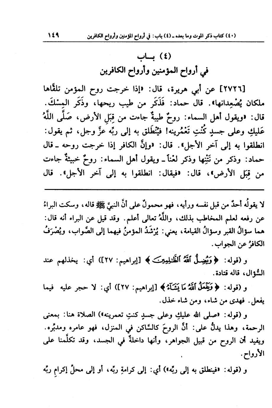 [2726] عَن أَبِي هُرَيرَةَ قَالَ: إِذَا خَرَجَت رُوحُ المُؤمِنِ تَلَقَّاهَا مَلَكَانِ يُصعِدَانِهَا. قَالَ حَمَّادٌ: فَذَكَرَ مِن طِيبِ رِيحِهَا وَذَكَرَ المِسكَ. قَالَ: وَيَقُولُ أَهلُ السَّمَاءِ: رُوحٌ طَيِّبَةٌ جَاءَت مِن قِبَلِ الأَرضِ، صَلَّى اللَّهُ عَلَيكِ وَعَلَى جَسَدٍ كُنتِ تَعمُرِينَهُ، فَيُنطَلَقُ بِهِ إِلَى رَبِّهِ عَزَّ وَجَلَّ ثُمَّ يَقُولُ: انطَلِقُوا بِهِ إِلَى آخِرِ الأَجَلِ. قَالَ: وَإِنَّ الكَافِرَ إِذَا خَرَجَت رُوحُهُ. قَالَ حَمَّادٌ: وَذَكَرَ مِن نَتنِهَا وَذَكَرَ لَعنًا. وَيَقُولُ أَهلُ السَّمَاءِ: رُوحٌ خَبِيثَةٌ جَاءَت مِن قِبَلِ الأَرضِ، قَالَ: فَيُقَالُ: انطَلِقُوا بِهِ إِلَى آخِرِ الأَجَلِ. قَالَ