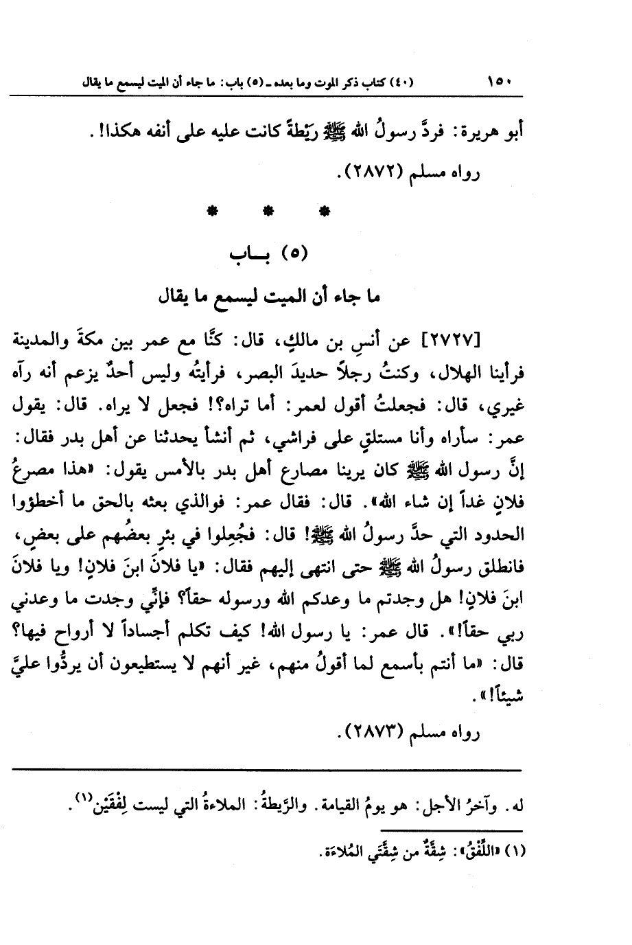 [2727] عَن أَنَسِ بنِ مَالِكٍ قَالَ: كُنَّا مَعَ عُمَرَ بَينَ مَكَّةَ وَالمَدِينَةِ، فَتَرَاءَينَا الهِلَالَ، وَكُنتُ رَجُلًا حَدِيدَ البَصَرِ فَرَأَيتُهُ وَلَيسَ أَحَدٌ يَزعُمُ أَنَّهُ رَآهُ غَيرِي، قَالَ: فَجَعَلتُ أَقُولُ لِعُمَرَ: أَمَا تَرَاهُ؟ فَجَعَلَ لَا يَرَاهُ، قَالَ: يَقُولُ عُمَرُ: سَأَرَاهُ وَأَنَا مُستَلقٍ عَلَى فِرَاشِي، ثُمَّ أَنشَأَ يُحَدِّثُنَا عَن أَهلِ بَدرٍ فَقَالَ: إِنَّ رَسُولَ اللَّهِ صَلَّى اللَّهُ عَلَيهِ وَسَلَّمَ كَانَ يُرِينَا مَصَارِعَ أَهلِ بَدرٍ بِالأَمسِ، يَقُولُ: هَذَا مَصرَعُ فُلَانٍ غَدًا إِن شَاءَ اللَّهُ، قَالَ: فَقَالَ عُمَرُ: فَوَالَّذِي بَعَثَهُ بِالحَقِّ مَا أَخطَؤوا الحُدُودَ الَّتِي حَدَّ رَسُولُ اللَّهِ صَلَّى اللَّهُ عَلَيهِ وَسَلَّمَ، قَالَ: فَجُعِلُوا فِي بِئرٍ بَعضُهُم عَلَى بَعضٍ، فَانطَلَقَ رَسُولُ اللَّهِ صَلَّى اللَّهُ عَلَيهِ وَسَلَّمَ حَتَّى انتَهَى إِلَيهِم فَقَالَ: يَا فُلَانَ ابنَ فُلَانٍ، وَيَا فُلَانَ ابنَ فُلَانٍ، هَل وَجَدتُم مَا وَعَدَكُم اللَّهُ وَرَسُولُهُ حَقًّا؟ فَإِنِّي وَجَدتُ مَا وَعَدَنِي ربي حَقًّا، قَالَ عُمَرُ: يَا رَسُولَ اللَّهِ كَيفَ تُكَلِّمُ أَجسَادًا لَا أَروَاحَ فِيهَا؟ قَالَ: مَا أَنتُم بِأَسمَعَ لِمَا أَقُولُ مِنهُم، غَيرَ أَنَّهُم لَا يَستَطِيعُونَ أَن يَرُدُّوا عَلَيَّ شَيئًا.