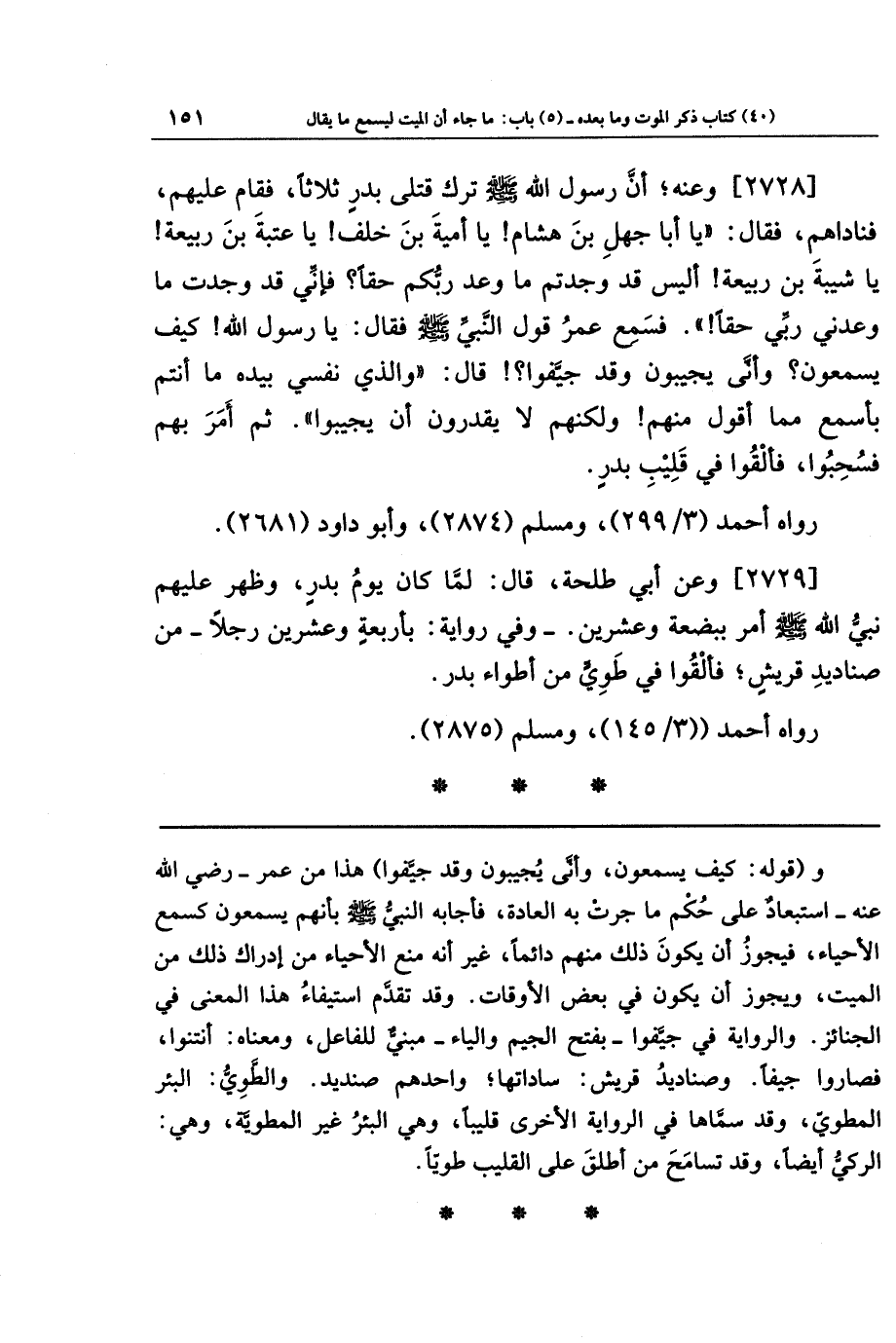 [2728] وعنه؛ أَنَّ رَسُولَ اللَّهِ صَلَّى اللَّهُ عَلَيهِ وَسَلَّمَ تَرَكَ قَتلَى بَدرٍ ثَلَاثًا، ثُمَّ أَتَاهُم فَقَامَ عَلَيهِم فَنَادَاهُم فَقَالَ: يَا أَبَا جَهلِ بنَ هِشَامٍ، يَا أُمَيَّةَ بنَ خَلَفٍ، يَا عُتبَةَ بنَ رَبِيعَةَ، يَا شَيبَةَ بنَ رَبِيعَةَ، أَلَيسَ قَد وَجَدتُم مَا وَعَدَ رَبُّكُم حَقًّا؟ فَإِنِّي قَد وَجَدتُ مَا وَعَدَنِي رَبِّي حَقًّا. فَسَمِعَ عُمَرُ قَولَ النَّبِيِّ صَلَّى اللَّهُ عَلَيهِ وَسَلَّمَ فَقَالَ: يَا رَسُولَ اللَّهِ كَيفَ يَسمَعُون وَأَنَّى يُجِيبُون وَقَد جَيَّفُوا؟ قَالَ: وَالَّذِي نَفسِي بِيَدِهِ مَا أَنتُم بِأَسمَعَ ممَا أَقُولُ مِنهُم، وَلَكِنَّهُم لَا يَقدِرُونَ أَن يُجِيبُوا. ثُمَّ أَمَرَ بِهِم فَسُحِبُوا فَأُلقُوا فِي قَلِيبِ بَدرٍ.