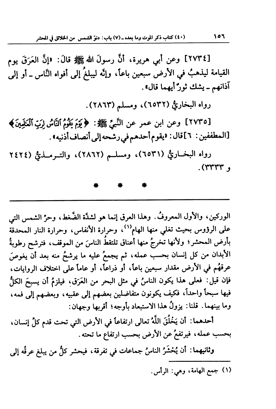 [2734] وعَن أَبِي هُرَيرَةَ أَنَّ رَسُولَ اللَّهِ صَلَّى اللَّهُ عَلَيهِ وَسَلَّمَ قَالَ: إِنَّ العَرَقَ يَومَ القِيَامَةِ لَيَذهَبُ فِي الأَرضِ سَبعِينَ بَاعًا، وَإِنَّهُ لَيَبلُغُ إِلَى أَفوَاهِ النَّاسِ أَو إِلَى آذَانِهِم. يَشُكُّ ثَورٌ أَيَّهُمَا قَالَ.