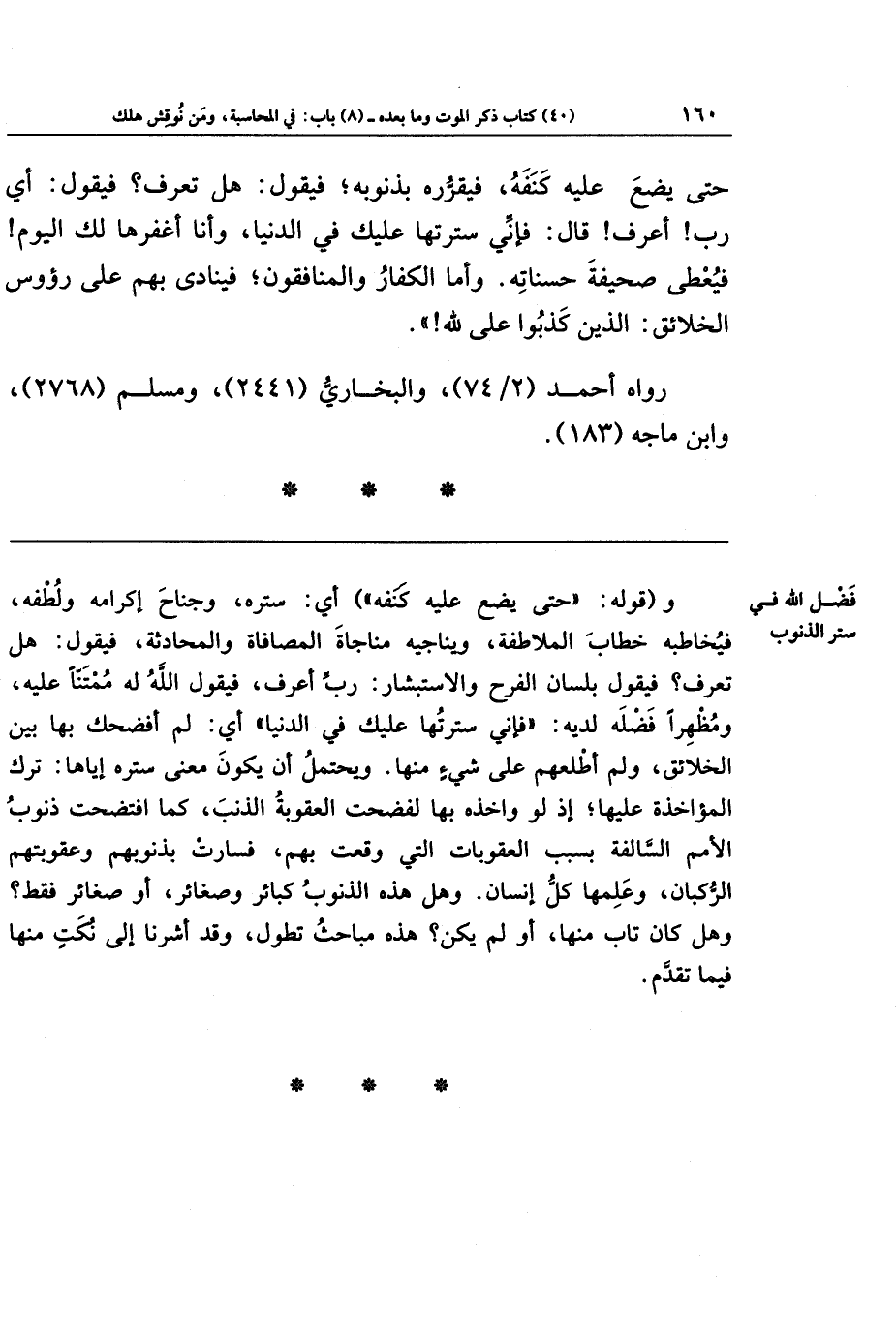 حَتَّى يَضَعَ عَلَيهِ كَنَفَهُ فَيُقَرِّرُهُ بِذُنُوبِهِ فَيَقُولُ: هَل تَعرِفُ؟ فَيَقُولُ: أَي رَبِّ أَعرِفُ، قَالَ: فَإِنِّي سَتَرتُهَا عَلَيكَ فِي الدُّنيَا وَإِنِّي أَغفِرُهَا لَكَ اليَومَ، فَيُعطَى صَحِيفَةَ حَسَنَاتِهِ. وَأَمَّا الكُفَّارُ وَالمُنَافِقُونَ فَيُنَادَى بِهِم عَلَى رُؤوسِ الخَلَائِقِ: الَّذِينَ كَذَبُوا عَلَى اللَّهِ.
