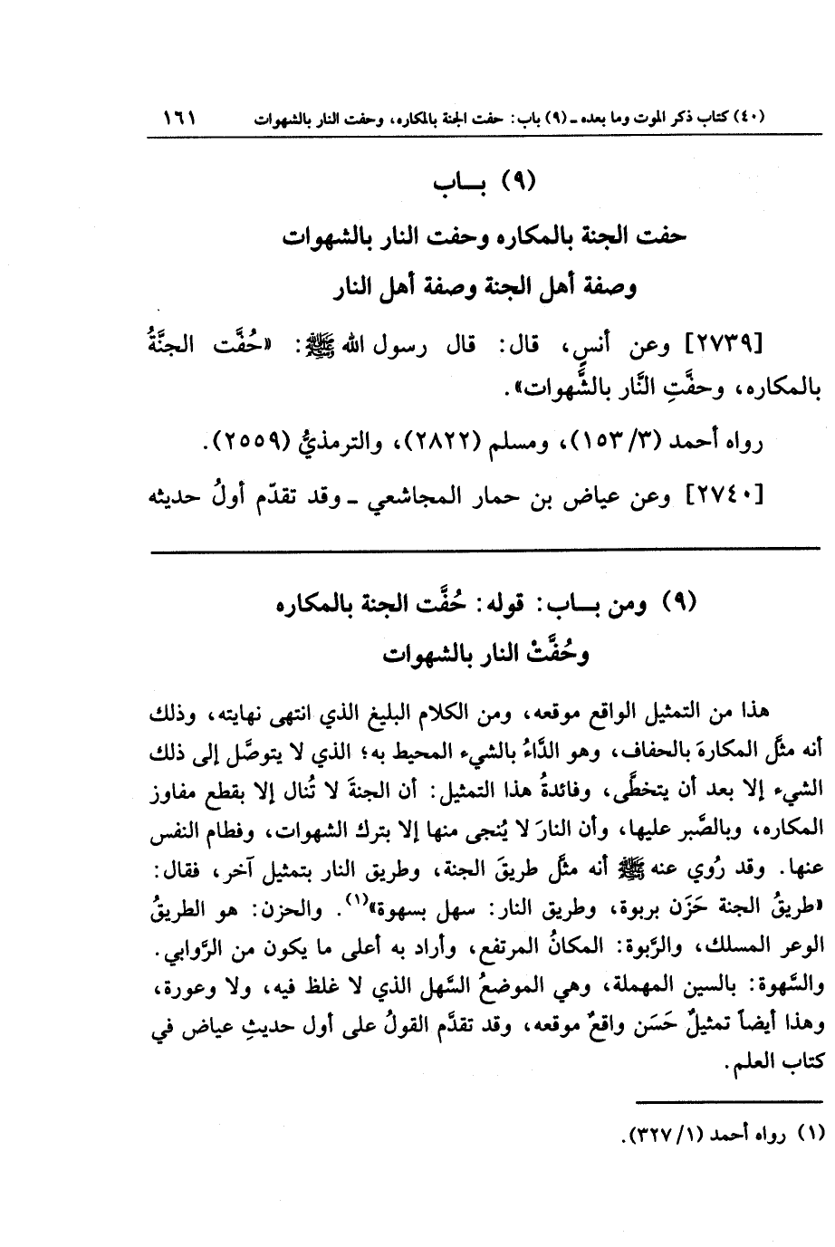 [2739] وعن أنس، قال: قال رسول الله صلى الله عليه وسلم: حفت الجنة بالمكاره وحفت النار بالشهوات.