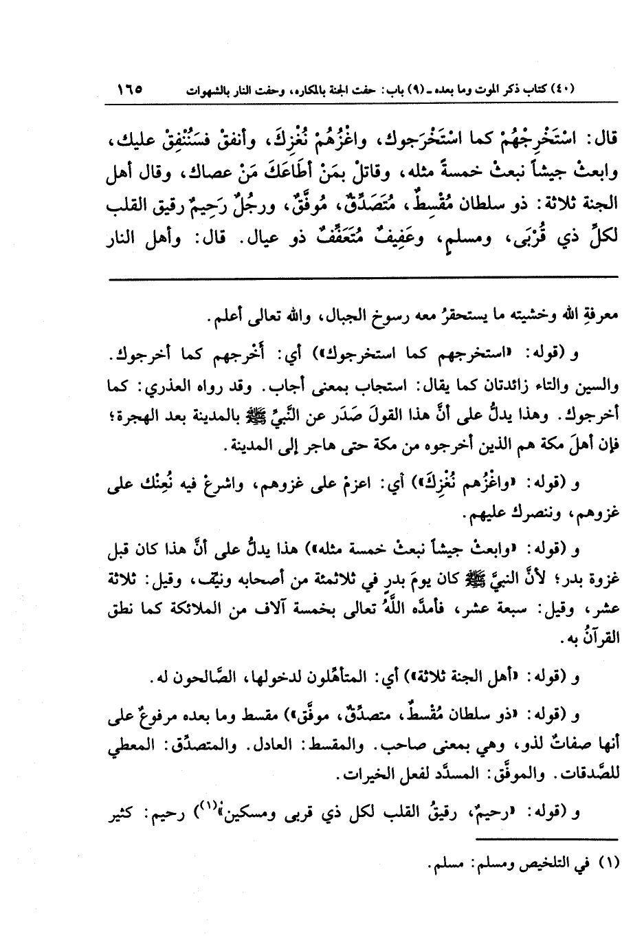 قَالَ: استَخرِجهُم كَمَا استَخرَجُوكَ، وَاغزُهُم نُغزِكَ، وَأَنفِق فَسَنُنفِقَ عَلَيكَ، وَابعَث جَيشًا نَبعَث خَمسَةً مِثلَهُ، وَقَاتِل بِمَن أَطَاعَكَ مَن عَصَاكَ، وقَالَ: أَهلُ الجَنَّةِ ثَلَاثَةٌ: ذُو سُلطَانٍ مُقسِطٌ مُتَصَدِّقٌ مُوَفَّقٌ، وَرَجُلٌ رَحِيمٌ رَقِيقُ القَلبِ لِكُلِّ ذِي قُربَى وَمُسلِمٍ، وَعَفِيفٌ مُتَعَفِّفٌ ذُو عِيَالٍ، قَالَ: وَأَهلُ النَّارِ