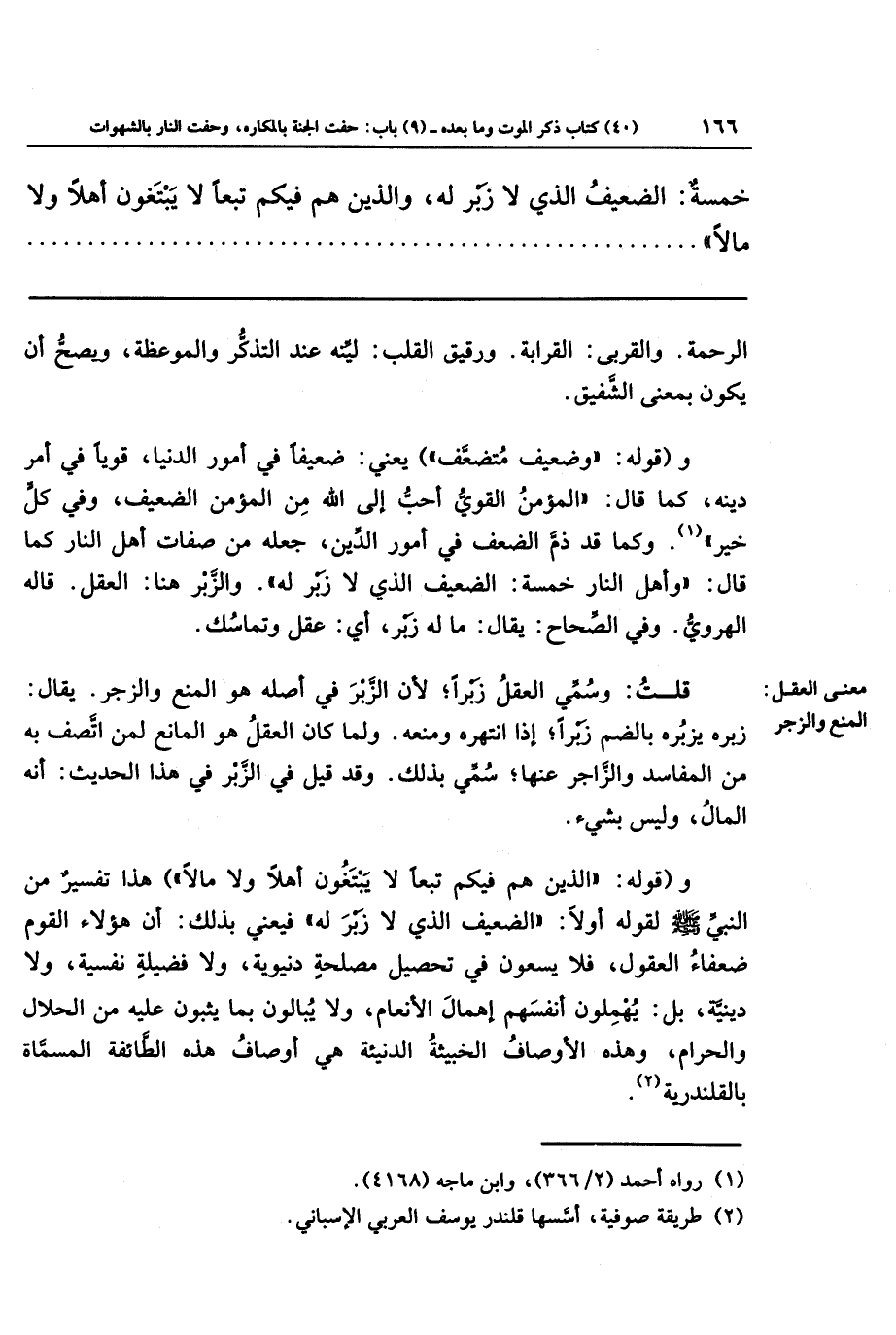 و(قوله: الذين هم فيكم تبعا لا يبتغون أهلا ولا مالا) هذا تفسير من النبي صلى الله عليه وسلم لقوله أولا: الضعيف الذي لا زبر له) فيعني بذلك: أن هؤلاء القوم ضعفاء العقول، فلا يسعون في تحصيل مصلحة دنيوية، ولا فضيلة نفسية ولا دينية، بل: يهملون أنفسهم إهمال الأنعام، ولا يبالون بما يثبون عليه من الحلال والحرام، وهذه الأوصاف الخبيثة الدنيئة هي أوصاف هذه الطائفة المسماة بالقلندرية (¬2).