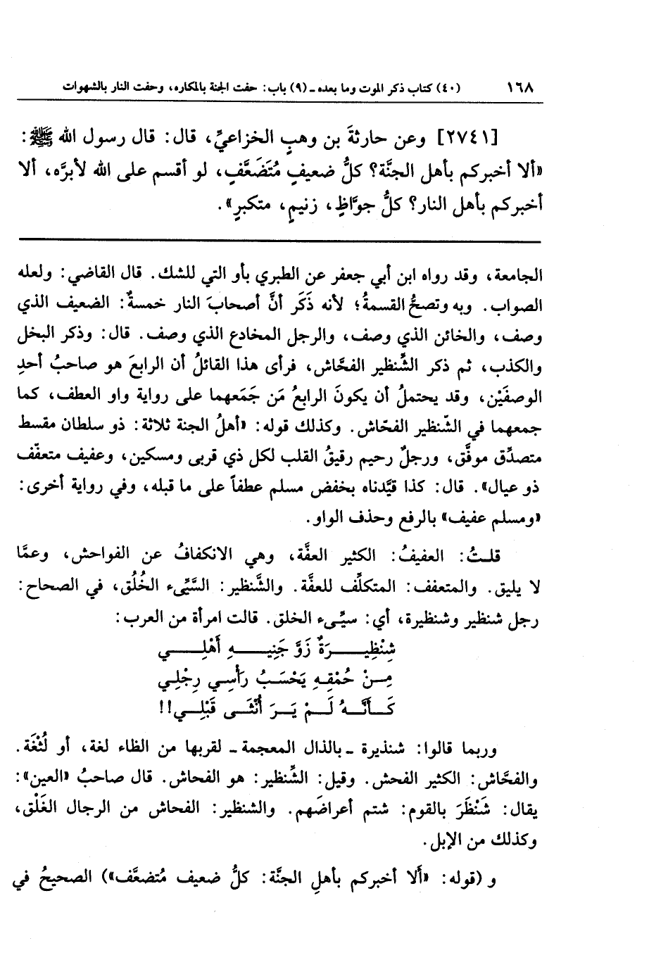 [2741] وعن حارثة بن وهب الخزاعي قال: قال رسول الله صلى الله عليه وسلم: ألا أخبركم بأهل الجنة؟ كل ضعيف متضعف، لو أقسم على الله لأبره، ألا أخبركم بأهل النار؟ كل جواظ زنيم متكبر.
