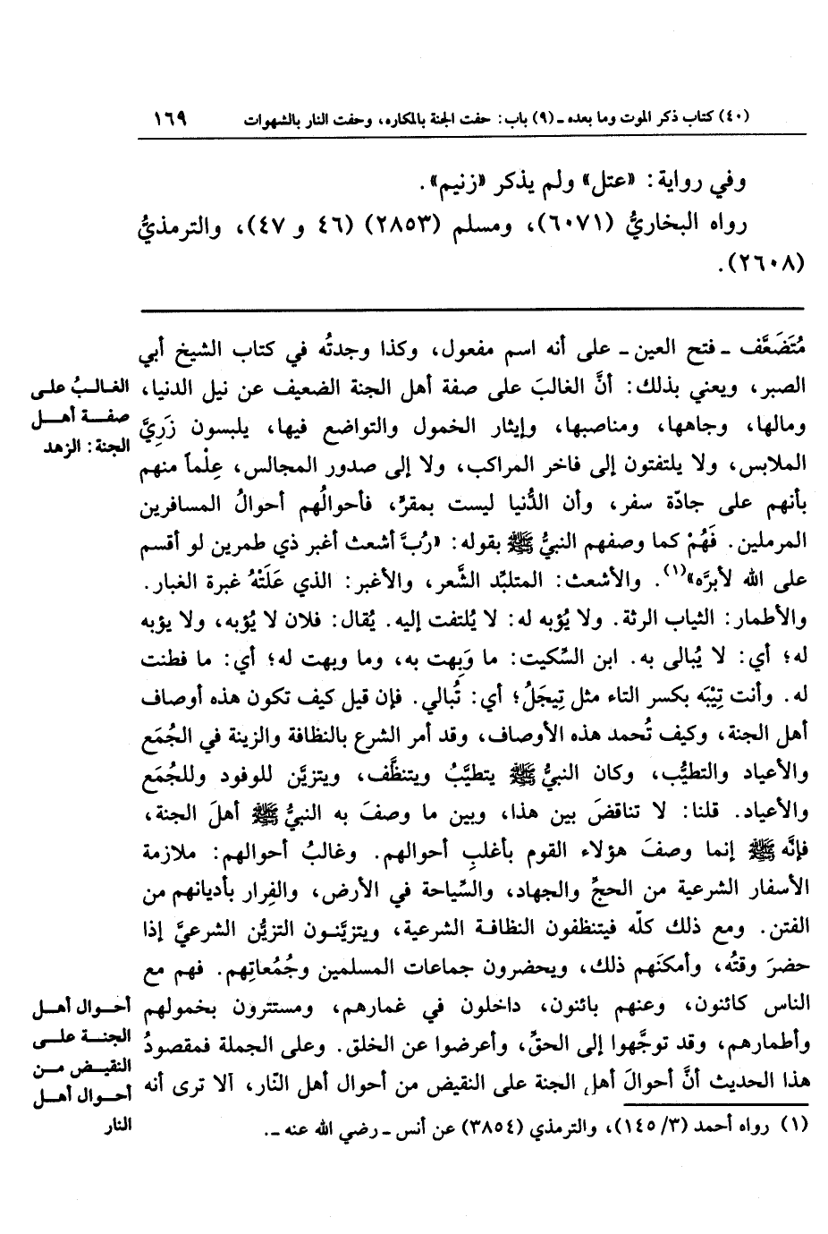 متضعف: فتح العين، على أنه اسم مفعول، وكذا وجدته في كتاب الشيخ أبي الصبر، ويعني بذلك: أن الغالب على صفة أهل الجنة الضعيف عن نيل الدنيا، ومالها، وجاهها، ومناصبها، وإيثار الخمول والتواضع فيها، يلبسون زري الملابس، ولا يلتفتون إلى فاخر المراكب، ولا إلى صدور المجالس، علما منهم بأنهم على جادة سفر، وأن الدنيا ليست بمقر، فأحوالهم أحوال المسافرين المرملين. فهم كما وصفهم النبي صلى الله عليه وسلم بقوله: رب أشعث أغبر ذي طمرين لو أقسم على الله لأبره (¬1). والأشعث: المتلبد الشعر، والأغبر: الذي علته غبرة الغبار. والأطمار: الثياب الرثة. ولا يؤبه له: لا يلتفت إليه. يقال: فلان لا يؤبه، ولا يؤبه له؛ أي: لا يبالى به. ابن السكيت: ما وبهت به، وما وبهت له؛ أي: ما فطنت له. وأنت تيبه، بكسر التاء مثل تيجل؛ أي: تبالي. فإن قيل: كيف تكون هذه أوصاف أهل الجنة، وكيف تحمد هذه الأوصاف وقد أمر الشرع بالنظافة والزينة في الجمع والأعياد والتطيب، وكان النبي صلى الله عليه وسلم يتطيب ويتنظف، ويتزين للوفود وللجمع والأعياد؟ قلنا: لا تناقض بين هذا وبين ما وصف به النبي صلى الله عليه وسلم أهل الجنة، فإنه صلى الله عليه وسلم إنما وصف هؤلاء القوم بأغلب أحوالهم. وغالب أحوالهم: ملازمة الأسفار الشرعية من الحج والجهاد، والسياحة في الأرض، والفرار بأديانهم من الفتن. ومع ذلك كله فيتنظفون النظافة الشرعية، ويتزينون التزين الشرعي إذا حضر وقته وأمكنهم ذلك، ويحضرون جماعات المسلمين وجمعاتهم. فهم مع الناس كائنون، وعنهم بائنون، داخلون في غمارهم، ومستترون بخمولهم وأطمارهم، وقد توجهوا إلى الحق وأعرضوا عن الخلق. وعلى الجملة فمقصود هذا الحديث أن أحوال أهل الجنة على النقيض من أحوال أهل النار، ألا ترى أنه