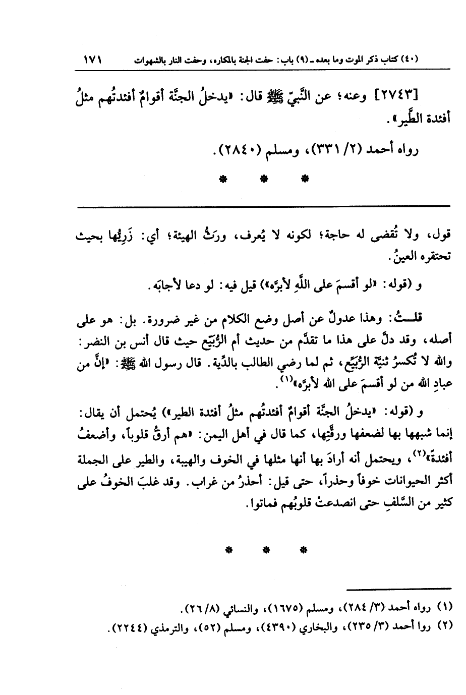 [2743] وعنه؛ عن النبي صلى الله عليه وسلم قال: يدخل الجنة أقوام أفئدتهم مثل أفئدة الطير.