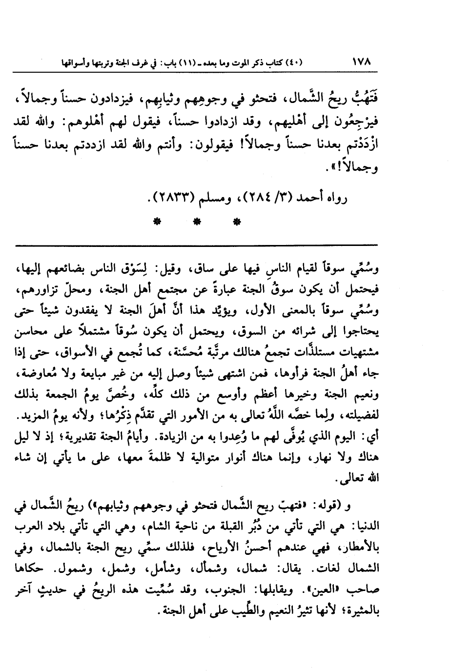 فتهب ريح الشمال فتحثو في وجوههم وثيابهم، فيزدادون حسنا وجمالا فيرجعون إلى أهليهم وقد ازدادوا حسنا فيقول لهم أهلوهم: والله لقد ازددتم بعدنا حسنا وجمالا، فيقولون: وأنتم والله لقد ازددتم بعدنا حسنا وجمالا.